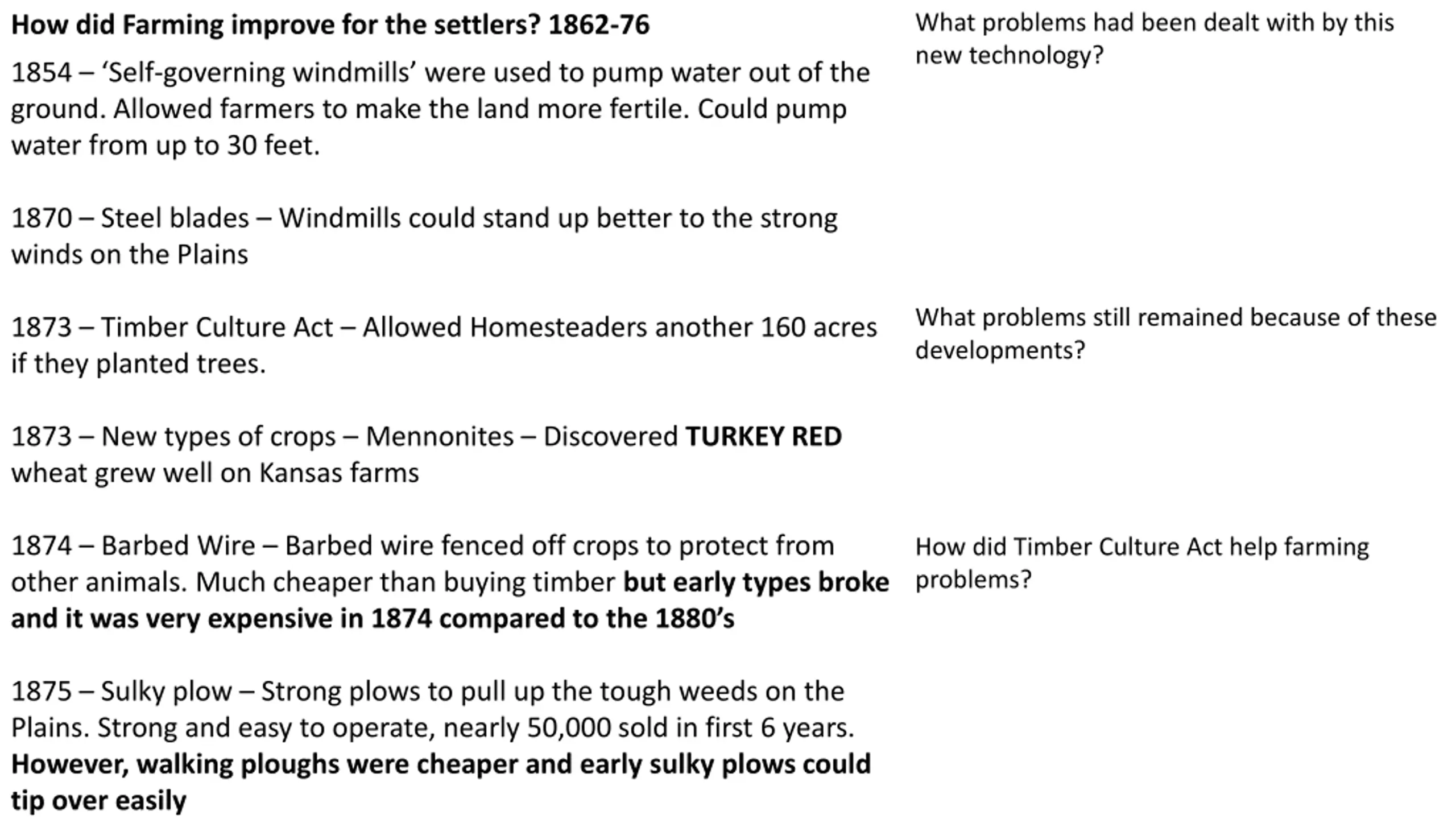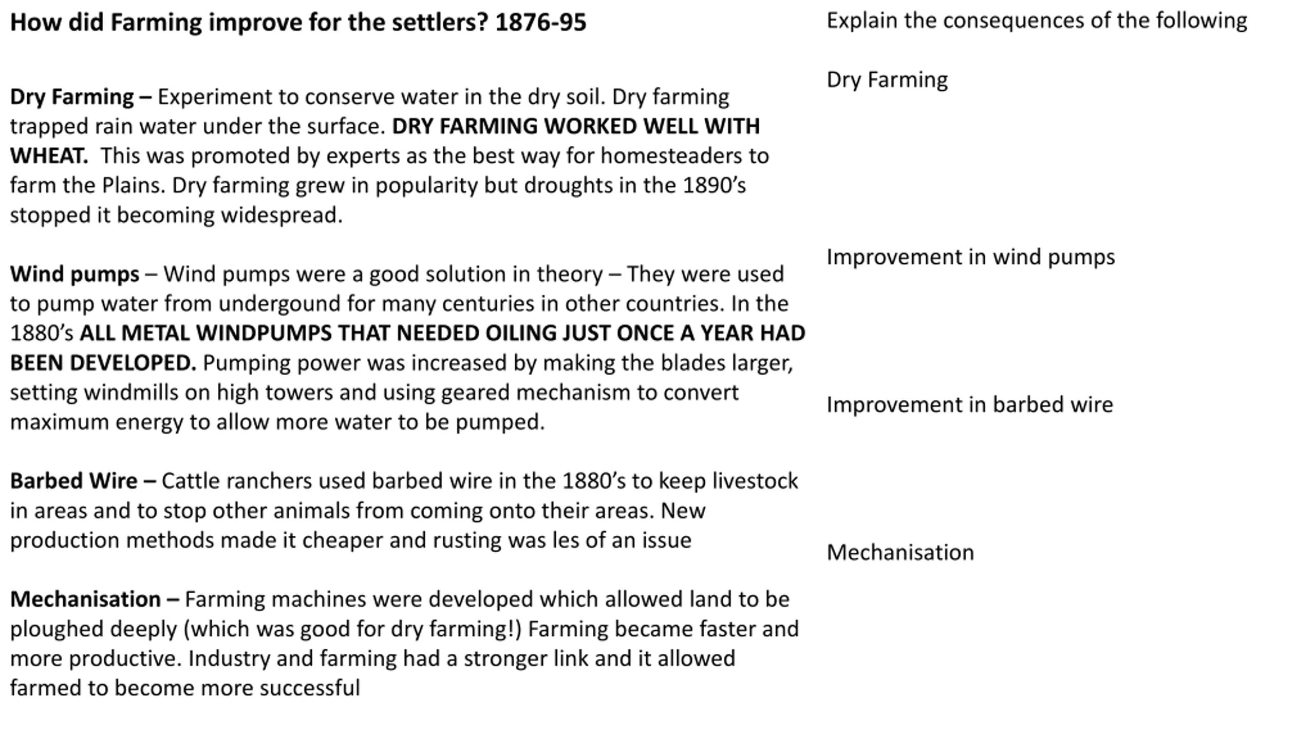 Explain the consequences of the following How did Farming improve for the settlers? 1876-95 Dry Farming Dry Farming Experiment to conserve water in the dry soil. Dry farming trapped rain water under the surface. DRY FARMING WORKED WELL WITH WHEAT. This was promoted by experts as the best way for homesteaders to farm the Plains. Dry farming grew in popularity but droughts in the 1890 s stopped it becoming widespread. Improvement in wind pumps Wind pumps Wind pumps were a good solution in theory They were used to pump water from undergound for many centuries in other countries. In the 1880 s ALL METAL WINDPUMPS THAT NEEDED OILING JUST ONCE A YEAR HAD BEEN DEVELOPED. Pumping power was increased by making the blades larger, setting windmills on high towers and using geared mechanism to convert maximum energy to allow more water to be pumped. Improvement in barbed wire Barbed Wire Cattle ranchers used barbed wire in the 1880 s to keep livestock in areas and to stop other animals from coming onto their areas. New production methods made it cheaper and rusting was les of an issue Mechanisation Mechanisation Farming machines were developed which allowed land to be ploughed deeply (which was good for dry farming!) Farming became faster and more productive. Industry and farming had a stronger link and it allowed farmed to become more successful
