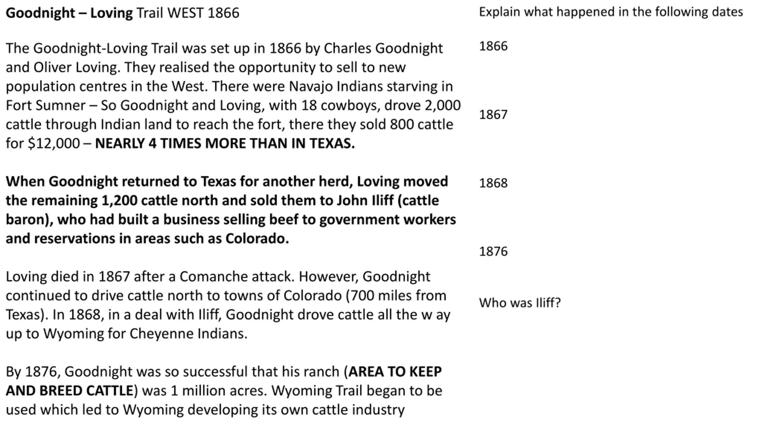 Explain what happened in the following dates Goodnight Loving Trail WEST 1866 1866 The Goodnight-Loving Trail was set up in 1866 by Charles Goodnight and Oliver Loving. They realised the opportunity to sell to new population centres in the West. There were Navajo Indians starving in Fort Sumner So Goodnight and Loving, with 18 cowboys, drove 2,000 cattle through Indian land to reach the fort, there they sold 800 cattle for $12,000 NEARLY 4 TIMES MORE THAN IN TEXAS. 1867 When Goodnight returned to Texas for another herd, Loving moved the remaining 1,200 cattle north and sold them to John Iliff (cattle baron), who had built a business selling beef to government workers and reservations in areas such as Colorado. 1868 1876 Loving died in 1867 after a Comanche attack. However, Goodnight continued to drive cattle north to towns of Colorado (700 miles from Texas). In 1868, in a deal with Iliff, Goodnight drove cattle all the w ay up to Wyoming for Cheyenne Indians. Who was Iliff? By 1876, Goodnight was so successful that his ranch (AREA TO KEEP AND BREED CATTLE) was 1 million acres. Wyoming Trail began to be used which led to Wyoming developing its own cattle industry