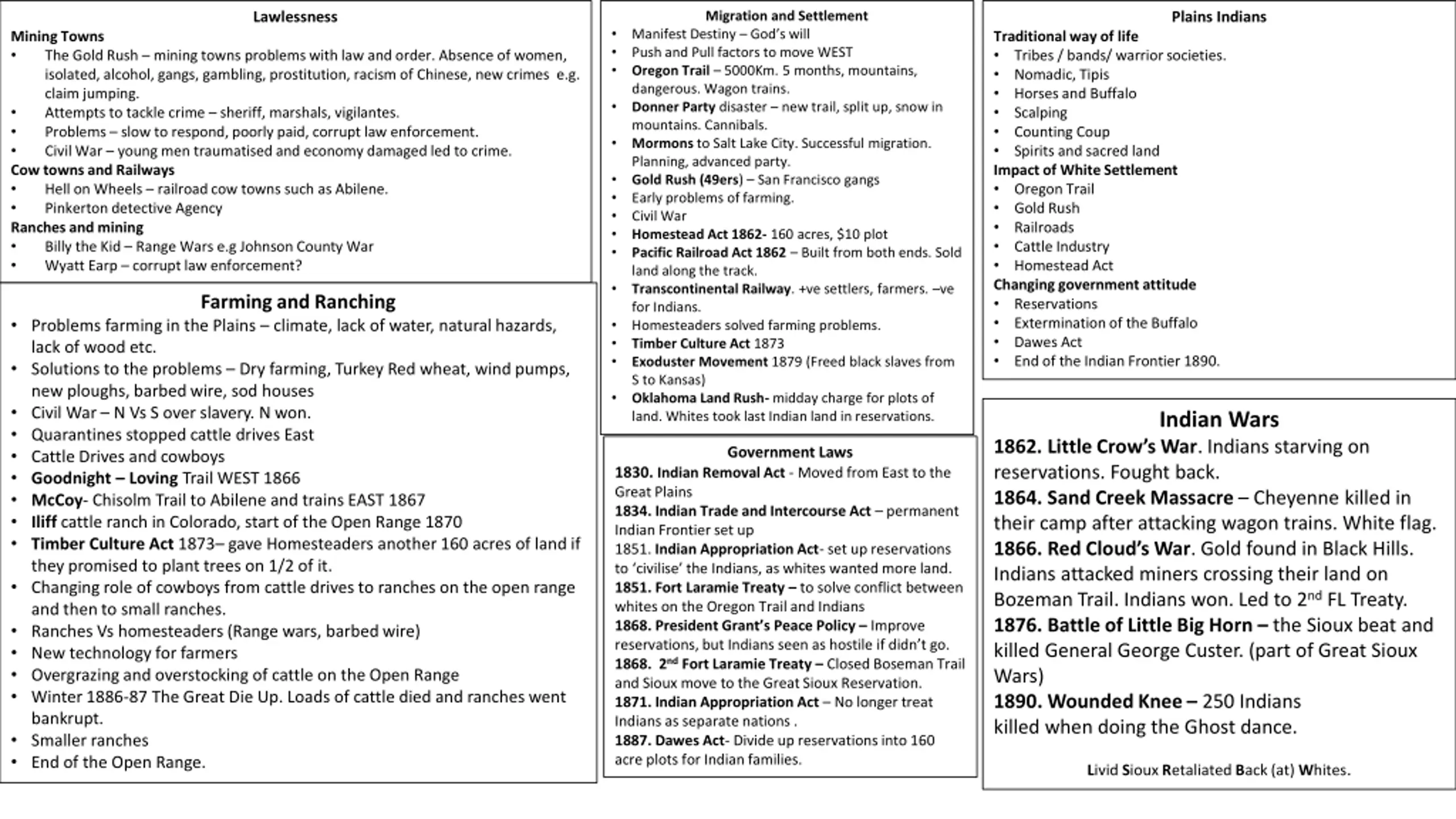 Migration and Settlement Manifest Destiny God s will Push and Pull factors to move WEST Oregon Trail 5000Km. 5 months, mountains, dangerous. Wagon trains. Donner Party disaster new trail, split up, snow in mountains. Cannibals. Mormons to Salt Lake City. Successful migration. Planning, advanced party. Gold Rush (49ers) San Francisco gangs Early problems of farming. Civil War Homestead Act 1862- 160 acres, $10 plot Pacific Railroad Act 1862 Built from both ends. Sold land along the track. Transcontinental Railway. +ve settlers, farmers. ve for Indians. Homesteaders solved farming problems. Timber Culture Act 1873 Exoduster Movement 1879 (Freed black slaves from S to Kansas) Oklahoma Land Rush- midday charge for plots of land. Whites took last Indian land in reservations. Lawlessness Plains Indians Mining Towns The Gold Rush mining towns problems with law and order. Absence of women, isolated, alcohol, gangs, gambling, prostitution, racism of Chinese, new crimes e.g. claim jumping. Attempts to tackle crime sheriff, marshals, vigilantes. Problems slow to respond, poorly paid, corrupt law enforcement. Civil War young men traumatised and economy damaged led to crime. Cow towns and Railways Hell on Wheels railroad cow towns such as Abilene. Pinkerton detective Agency Ranches and mining Billy the Kid Range Wars e.g Johnson County War Wyatt Earp corrupt law enforcement? Traditional way of life Tribes / bands/ warrior societies. Nomadic, Tipis Horses and Buffalo Scalping Counting Coup Spirits and sacred land Impact of White Settlement Oregon Trail Gold Rush Railroads Cattle Industry Homestead Act Changing government attitude Reservations Extermination of the Buffalo Dawes Act End of the Indian Frontier 1890. Farming and Ranching Problems farming in the Plains climate, lack of water, natural hazards, lack of wood etc. Solutions to the problems Dry farming, Turkey Red wheat, wind pumps, new ploughs, barbed wire, sod houses Civil War N Vs S over slavery. N won. Quarantines stopped cattle drives East Cattle Drives and cowboys Goodnight Loving Trail WEST 1866 McCoy- Chisolm Trail to Abilene and trains EAST 1867 Iliff cattle ranch in Colorado, start of the Open Range 1870 Timber Culture Act 1873 gave Homesteaders another 160 acres of land if they promised to plant trees on 1/2 of it. Changing role of cowboys from cattle drives to ranches on the open range and then to small ranches. Ranches Vs homesteaders (Range wars, barbed wire) New technology for farmers Overgrazing and overstocking of cattle on the Open Range Winter 1886-87 The Great Die Up. Loads of cattle died and ranches went bankrupt. Smaller ranches End of the Open Range. Indian Wars 1862. Little Crow s War. Indians starving on reservations. Fought back. 1864. Sand Creek Massacre Cheyenne killed in their camp after attacking wagon trains. White flag. 1866. Red Cloud s War. Gold found in Black Hills. Indians attacked miners crossing their land on Bozeman Trail. Indians won. Led to 2nd FL Treaty. 1876. Battle of Little Big Horn the Sioux beat and killed General George Custer. (part of Great Sioux Wars) 1890. Wounded Knee 250 Indians killed when doing the Ghost dance. Government Laws 1830. Indian Removal Act - Moved from East to the Great Plains 1834. Indian Trade and Intercourse Act permanent Indian Frontier set up 1851. Indian Appropriation Act- set up reservations to civilise the Indians, as whites wanted more land. 1851. Fort Laramie Treaty to solve conflict between whites on the Oregon Trail and Indians 1868. President Grant s Peace Policy Improve reservations, but Indians seen as hostile if didn t go. 1868. 2nd Fort Laramie Treaty Closed Boseman Trail and Sioux move to the Great Sioux Reservation. 1871. Indian Appropriation Act No longer treat Indians as separate nations . 1887. Dawes Act- Divide up reservations into 160 acre plots for Indian families. Livid Sioux Retaliated Back (at) Whites.