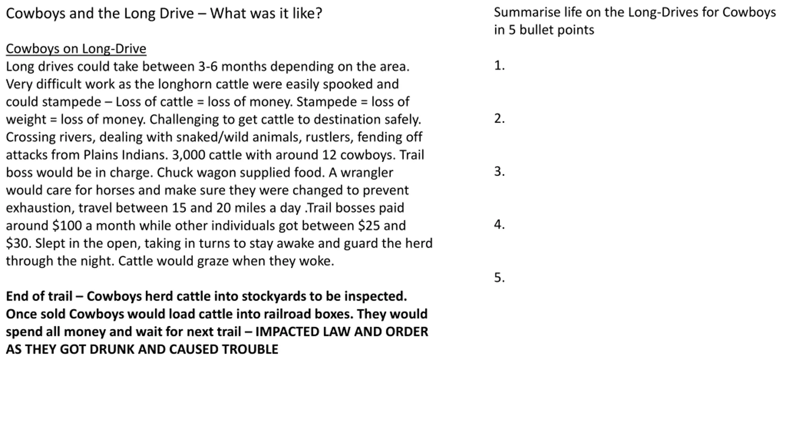 Summarise life on the Long-Drives for Cowboys in 5 bullet points Cowboys and the Long Drive What was it like? Cowboys on Long-Drive Long drives could take between 3-6 months depending on the area. Very difficult work as the longhorn cattle were easily spooked and could stampede Loss of cattle = loss of money. Stampede = loss of weight = loss of money. Challenging to get cattle to destination safely. Crossing rivers, dealing with snaked/wild animals, rustlers, fending off attacks from Plains Indians. 3,000 cattle with around 12 cowboys. Trail boss would be in charge. Chuck wagon supplied food. A wrangler would care for horses and make sure they were changed to prevent exhaustion, travel between 15 and 20 miles a day .Trail bosses paid around $100 a month while other individuals got between $25 and $30. Slept in the open, taking in turns to stay awake and guard the herd through the night. Cattle would graze when they woke. 1. 2. 3. 4. 5. End of trail Cowboys herd cattle into stockyards to be inspected. Once sold Cowboys would load cattle into railroad boxes. They would spend all money and wait for next trail IMPACTED LAW AND ORDER AS THEY GOT DRUNK AND CAUSED TROUBLE