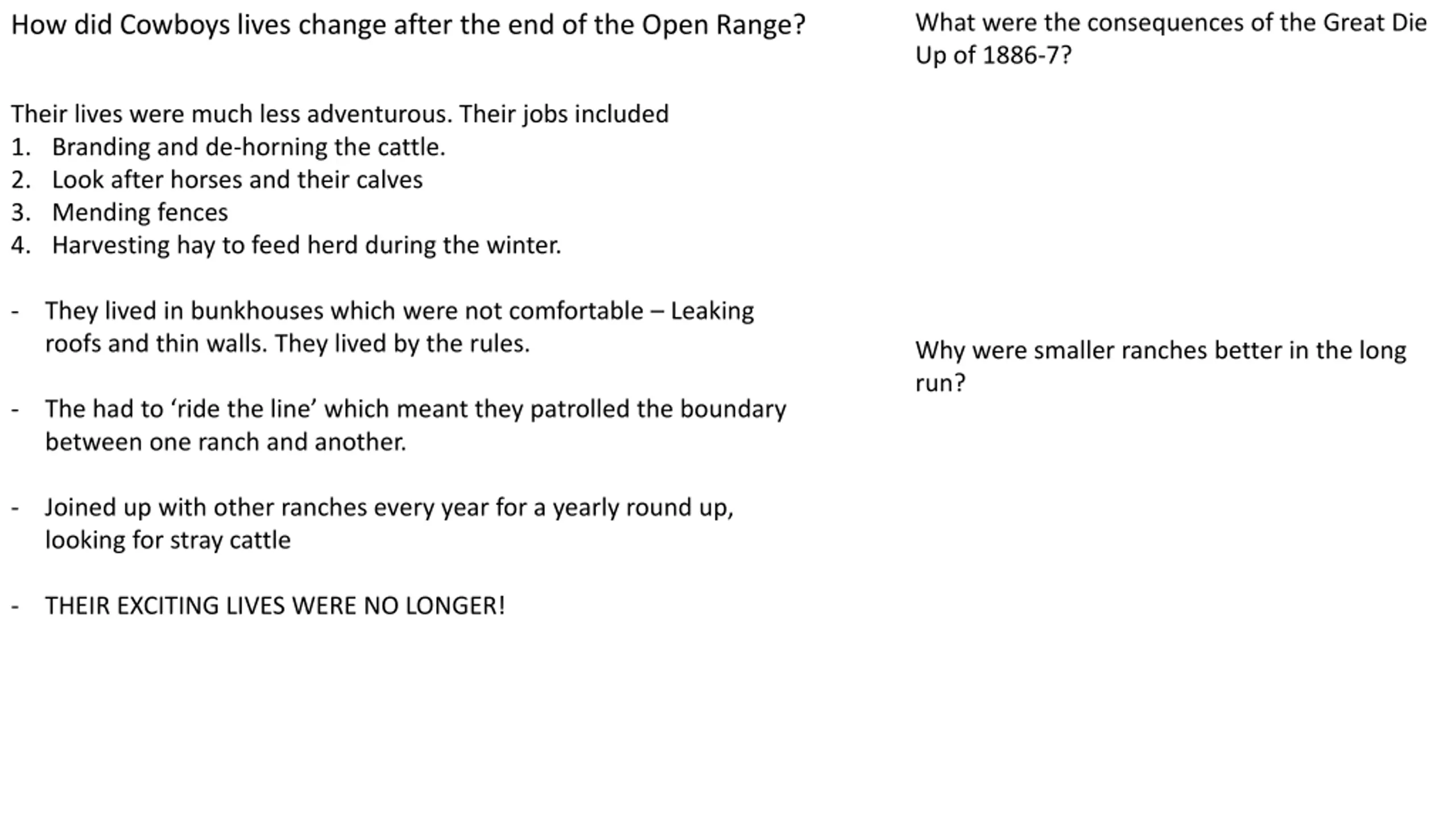 What were the consequences of the Great Die Up of 1886-7? How did Cowboys lives change after the end of the Open Range? Their lives were much less adventurous. Their jobs included 1. Branding and de-horning the cattle. 2. Look after horses and their calves 3. Mending fences 4. Harvesting hay to feed herd during the winter. - They lived in bunkhouses which were not comfortable Leaking roofs and thin walls. They lived by the rules. Why were smaller ranches better in the long run? - The had to ride the line which meant they patrolled the boundary between one ranch and another. - Joined up with other ranches every year for a yearly round up, looking for stray cattle - THEIR EXCITING LIVES WERE NO LONGER!