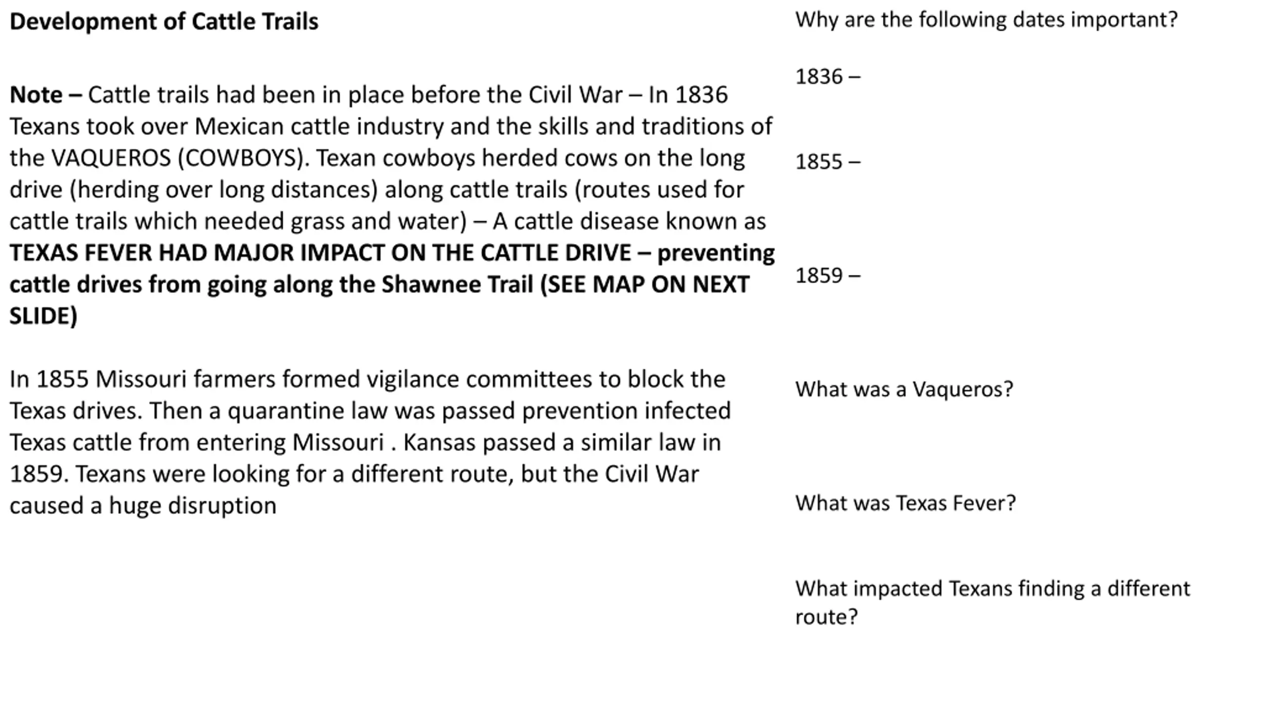 Why are the following dates important? Development of Cattle Trails 1836 Note Cattle trails had been in place before the Civil War In 1836 Texans took over Mexican cattle industry and the skills and traditions of the VAQUEROS (COWBOYS). Texan cowboys herded cows on the long drive (herding over long distances) along cattle trails (routes used for cattle trails which needed grass and water) A cattle disease known as TEXAS FEVER HAD MAJOR IMPACT ON THE CATTLE DRIVE preventing cattle drives from going along the Shawnee Trail (SEE MAP ON NEXT SLIDE) 1855 1859 In 1855 Missouri farmers formed vigilance committees to block the Texas drives. Then a quarantine law was passed prevention infected Texas cattle from entering Missouri . Kansas passed a similar law in 1859. Texans were looking for a different route, but the Civil War caused a huge disruption What was a Vaqueros? What was Texas Fever? What impacted Texans finding a different route?