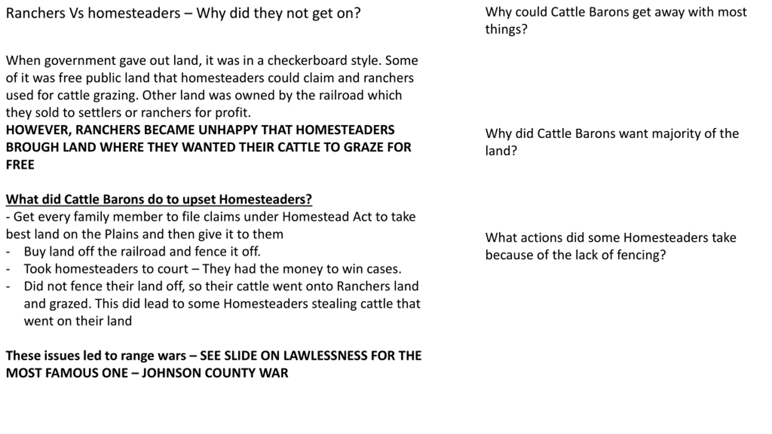 Why could Cattle Barons get away with most things? Ranchers Vs homesteaders Why did they not get on? When government gave out land, it was in a checkerboard style. Some of it was free public land that homesteaders could claim and ranchers used for cattle grazing. Other land was owned by the railroad which they sold to settlers or ranchers for profit. HOWEVER, RANCHERS BECAME UNHAPPY THAT HOMESTEADERS BROUGH LAND WHERE THEY WANTED THEIR CATTLE TO GRAZE FOR FREE Why did Cattle Barons want majority of the land? What did Cattle Barons do to upset Homesteaders? - Get every family member to file claims under Homestead Act to take best land on the Plains and then give it to them - Buy land off the railroad and fence it off. - Took homesteaders to court They had the money to win cases. - Did not fence their land off, so their cattle went onto Ranchers land and grazed. This did lead to some Homesteaders stealing cattle that went on their land What actions did some Homesteaders take because of the lack of fencing? These issues led to range wars SEE SLIDE ON LAWLESSNESS FOR THE MOST FAMOUS ONE JOHNSON COUNTY WAR