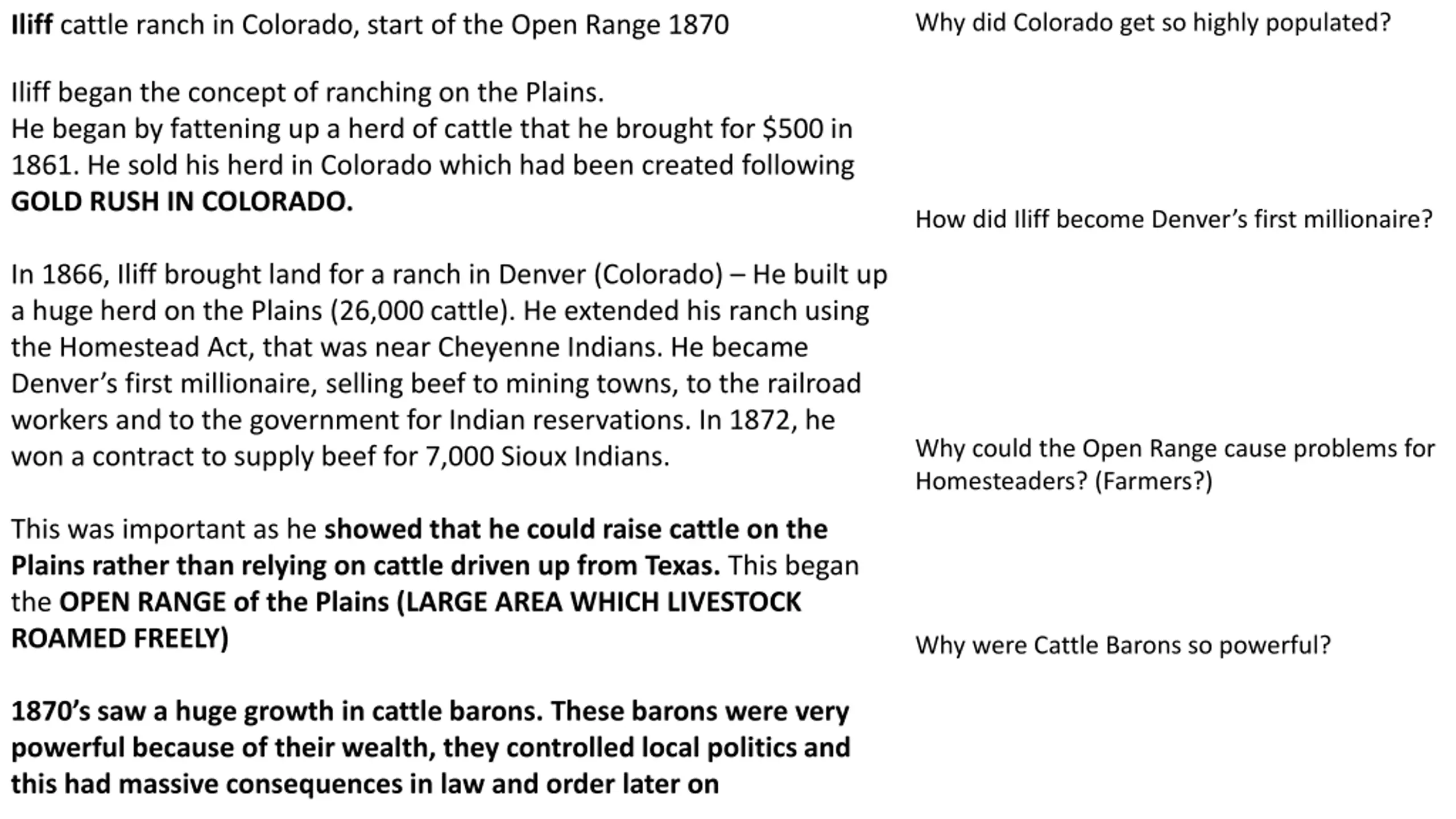 Why did Colorado get so highly populated? Iliff cattle ranch in Colorado, start of the Open Range 1870 Iliff began the concept of ranching on the Plains. He began by fattening up a herd of cattle that he brought for $500 in 1861. He sold his herd in Colorado which had been created following GOLD RUSH IN COLORADO. How did Iliff become Denver s first millionaire? In 1866, Iliff brought land for a ranch in Denver (Colorado) He built up a huge herd on the Plains (26,000 cattle). He extended his ranch using the Homestead Act, that was near Cheyenne Indians. He became Denver s first millionaire, selling beef to mining towns, to the railroad workers and to the government for Indian reservations. In 1872, he won a contract to supply beef for 7,000 Sioux Indians. Why could the Open Range cause problems for Homesteaders? (Farmers?) This was important as he showed that he could raise cattle on the Plains rather than relying on cattle driven up from Texas. This began the OPEN RANGE of the Plains (LARGE AREA WHICH LIVESTOCK ROAMED FREELY) Why were Cattle Barons so powerful? 1870 s saw a huge growth in cattle barons. These barons were very powerful because of their wealth, they controlled local politics and this had massive consequences in law and order later on