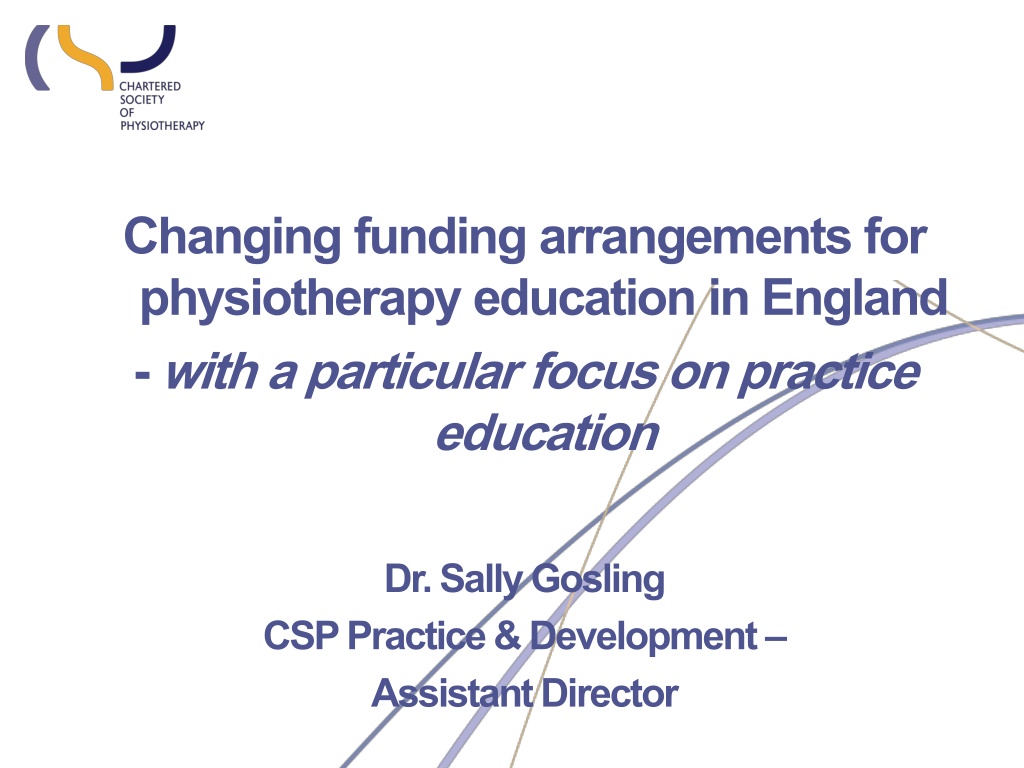 Changing funding arrangements for physiotherapy education in England -with a particular focus on practice education Dr.Sally Gosling CSP Practice & Development Assistant Director