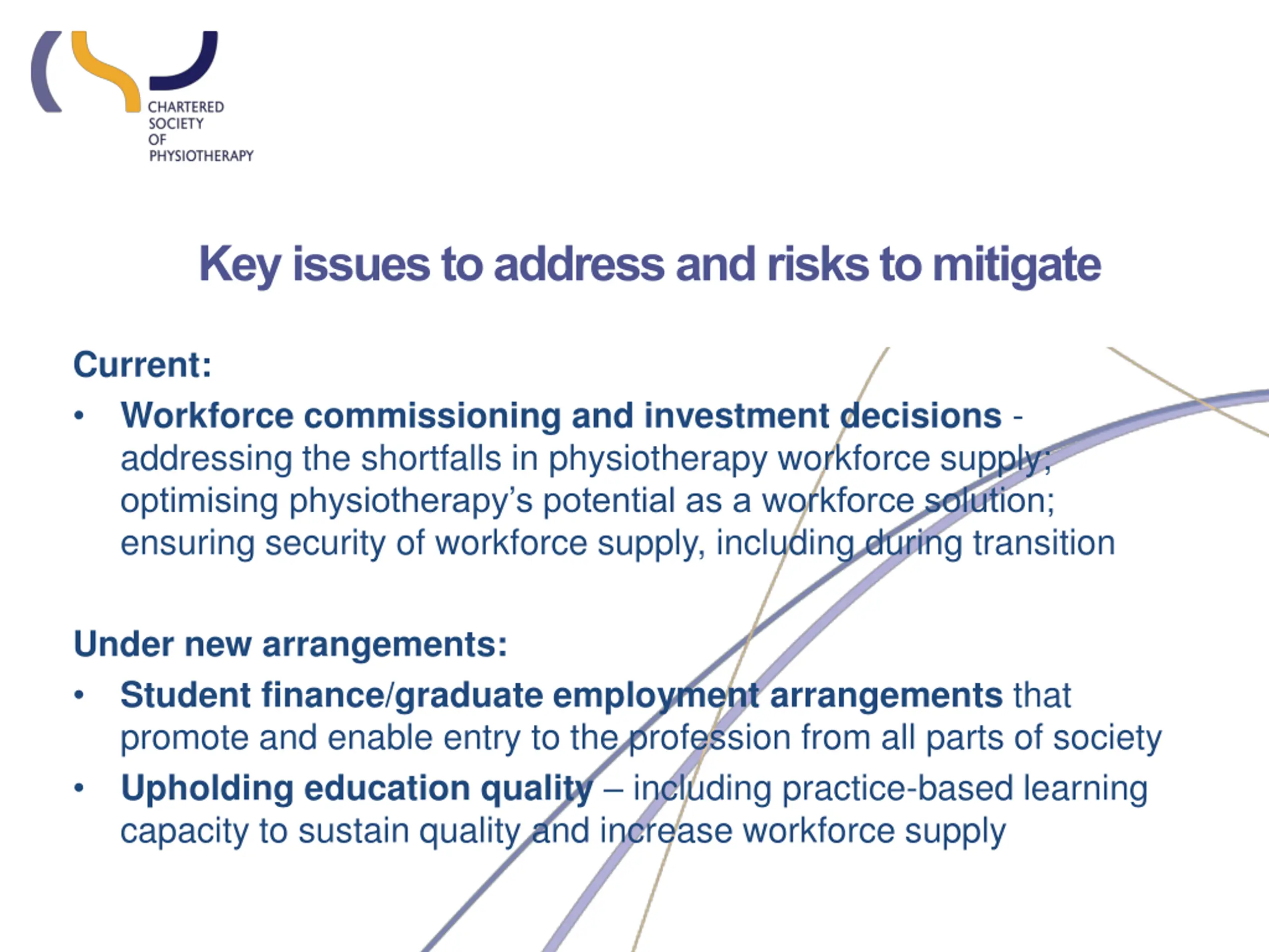 Key issues to address and risks to mitigate Current: Workforce commissioning and investment decisions - addressing the shortfalls in physiotherapy workforce supply; optimising physiotherapy s potential as a workforce solution; ensuring security of workforce supply, including during transition Under new arrangements: Student finance/graduate employment arrangements that promote and enable entry to the profession from all parts of society Upholding education quality including practice-based learning capacity to sustain quality and increase workforce supply
