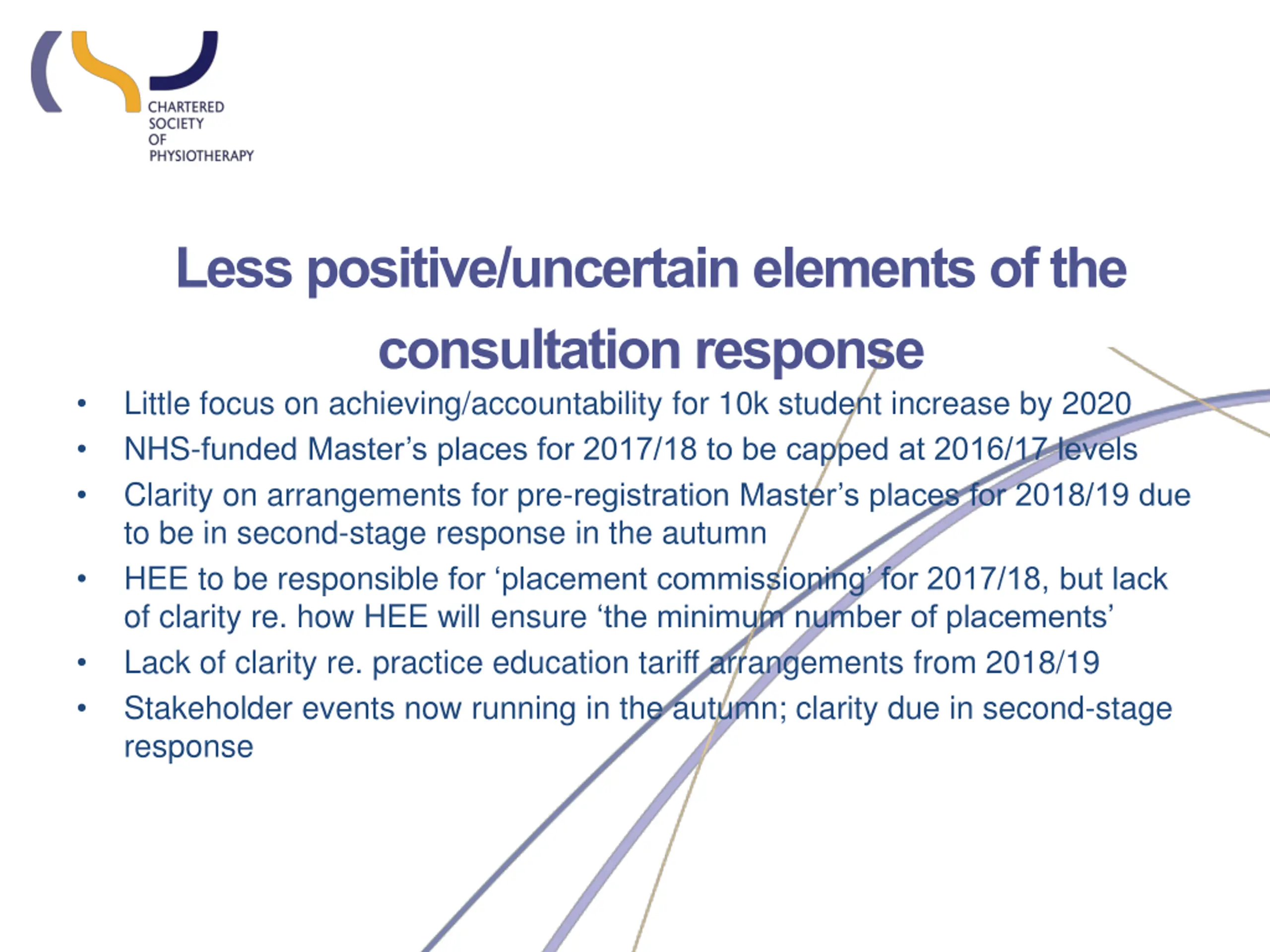 Less positive/uncertain elements of the consultation response Little focus on achieving/accountability for 10k student increase by 2020 NHS-funded Master s places for 2017/18 to be capped at 2016/17 levels Clarity on arrangements for pre-registration Master s places for 2018/19 due to be in second-stage response in the autumn HEE to be responsible for placement commissioning for 2017/18, but lack of clarity re. how HEE will ensure the minimum number of placements Lack of clarity re. practice education tariff arrangements from 2018/19 Stakeholder events now running in the autumn; clarity due in second-stage response
