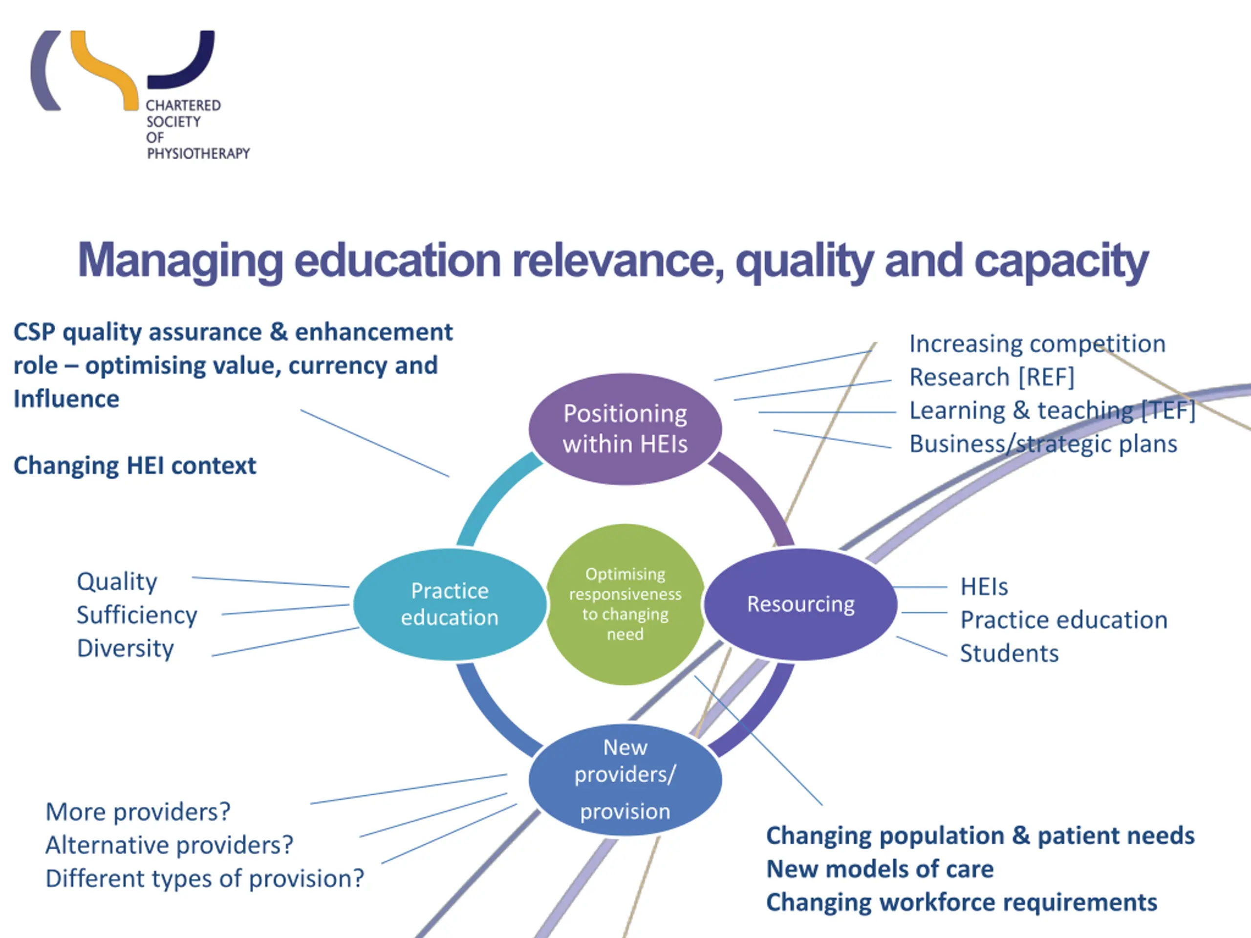 Managing education relevance, quality and capacity CSP quality assurance & enhancement role optimising value, currency and Influence Increasing competition Research [REF] Learning & teaching [TEF] Business/strategic plans Positioning within HEIs Changing HEI context Optimising responsiveness to changing need Quality Sufficiency Diversity HEIs Practice education Students Practice education Resourcing New providers/ More providers? Alternative providers? Different types of provision? provision Changing population & patient needs New models of care Changing workforce requirements