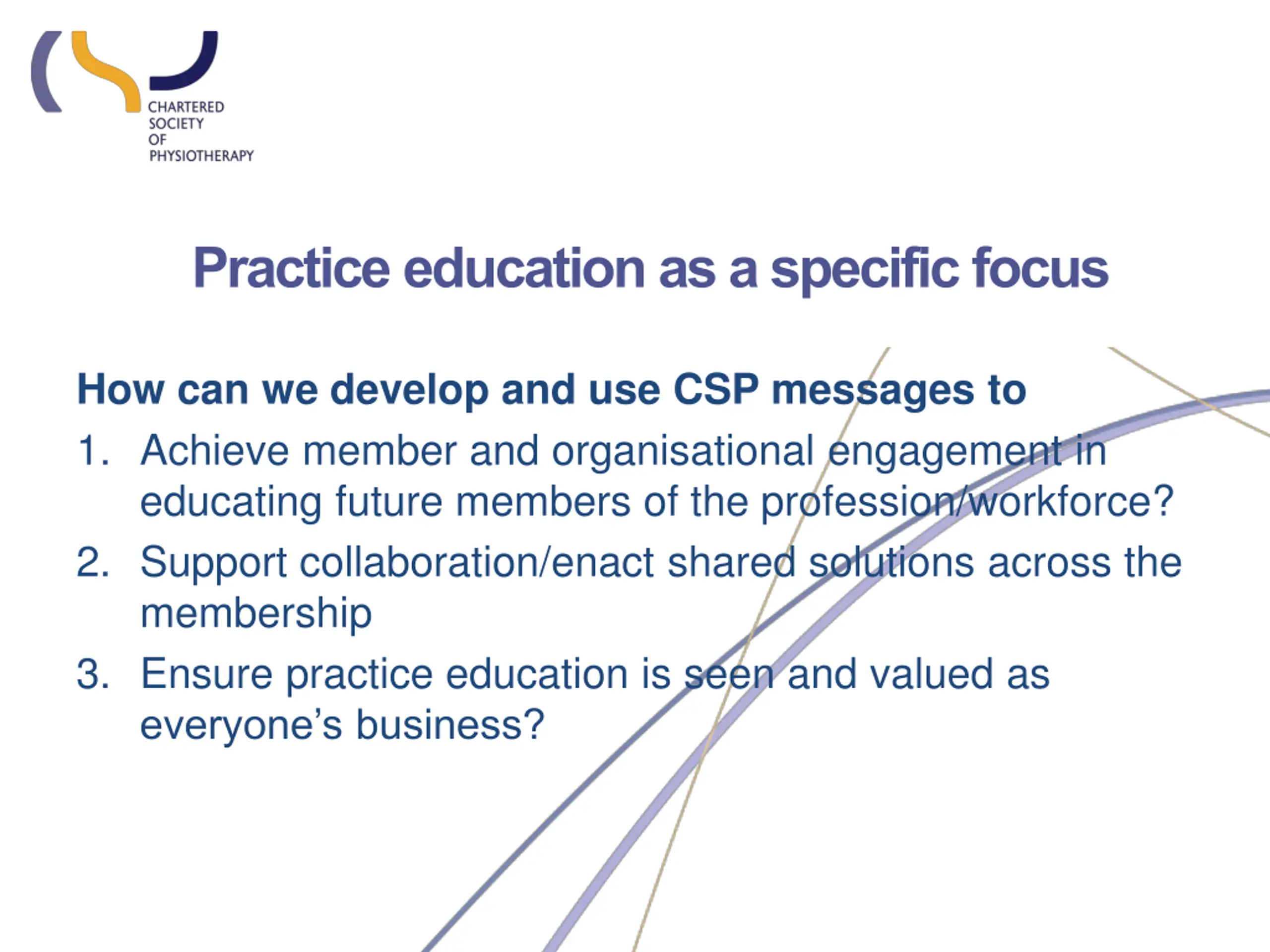 Practice education as a specific focus How can we develop and use CSP messages to 1. Achieve member and organisational engagement in educating future members of the profession/workforce? 2. Support collaboration/enact shared solutions across the membership 3. Ensure practice education is seen and valued as everyone s business?