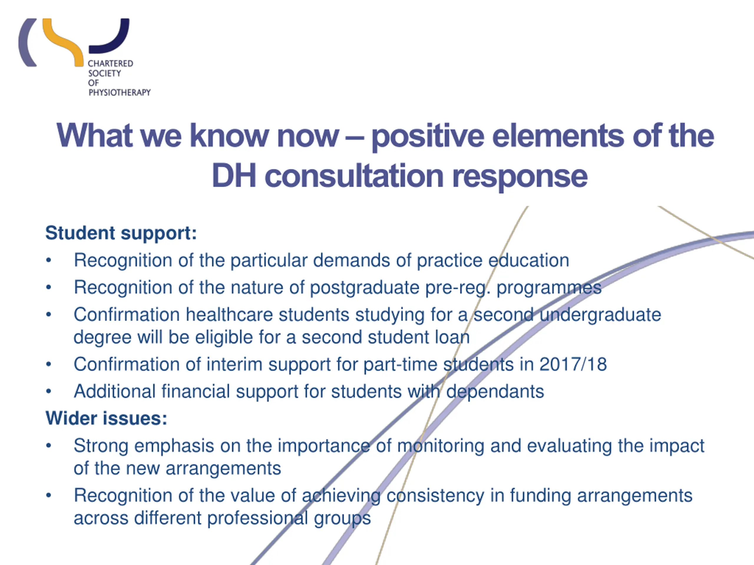 What we know now positive elements of the DH consultation response Student support: Recognition of the particular demands of practice education Recognition of the nature of postgraduate pre-reg. programmes Confirmation healthcare students studying for a second undergraduate degree will be eligible for a second student loan Confirmation of interim support for part-time students in 2017/18 Additional financial support for students with dependants Wider issues: Strong emphasis on the importance of monitoring and evaluating the impact of the new arrangements Recognition of the value of achieving consistency in funding arrangements across different professional groups