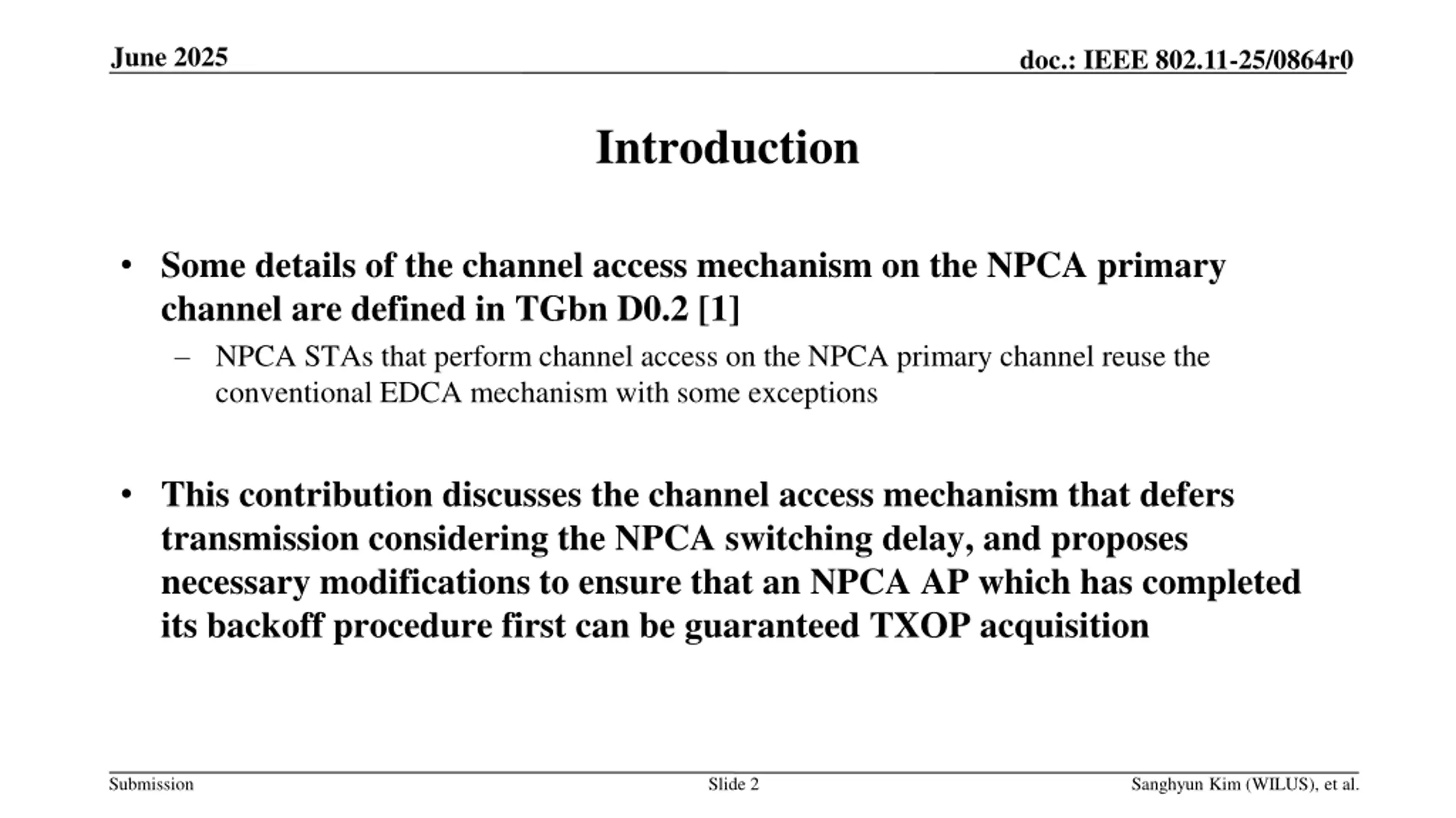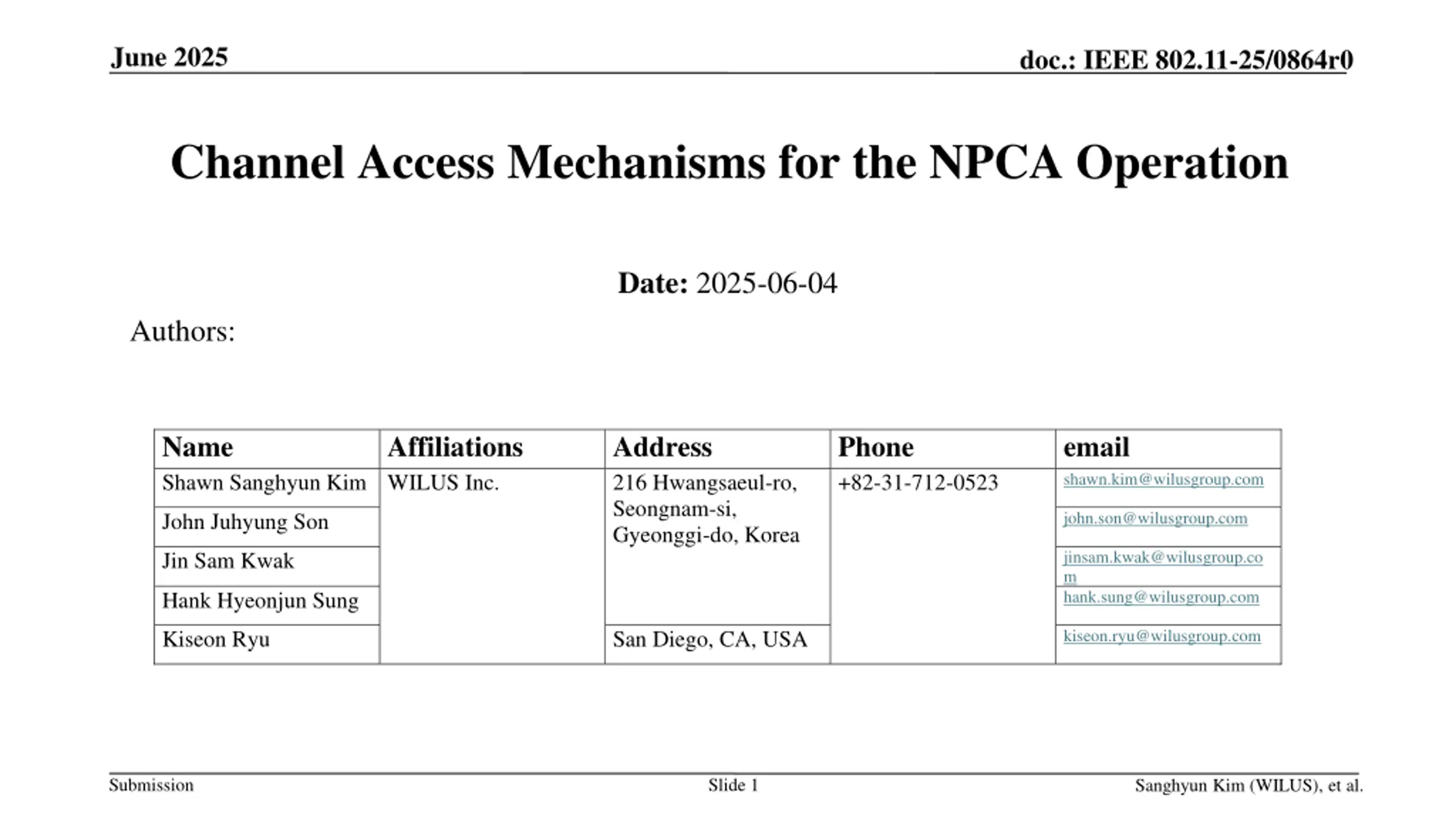 June 2025 doc.: IEEE 802.11-25/0864r0 Channel Access Mechanisms for the NPCA Operation Date: 2025-06-04 Authors: Name Shawn Sanghyun Kim WILUS Inc. Affiliations Address 216 Hwangsaeul-ro, Seongnam-si, Gyeonggi-do, Korea Phone +82-31-712-0523 email shawn.kim@wilusgroup.com john.son@wilusgroup.com John Juhyung Son jinsam.kwak@wilusgroup.co m hank.sung@wilusgroup.com Jin Sam Kwak Hank Hyeonjun Sung kiseon.ryu@wilusgroup.com Kiseon Ryu San Diego, CA, USA Submission Slide 1 Sanghyun Kim (WILUS), et al.