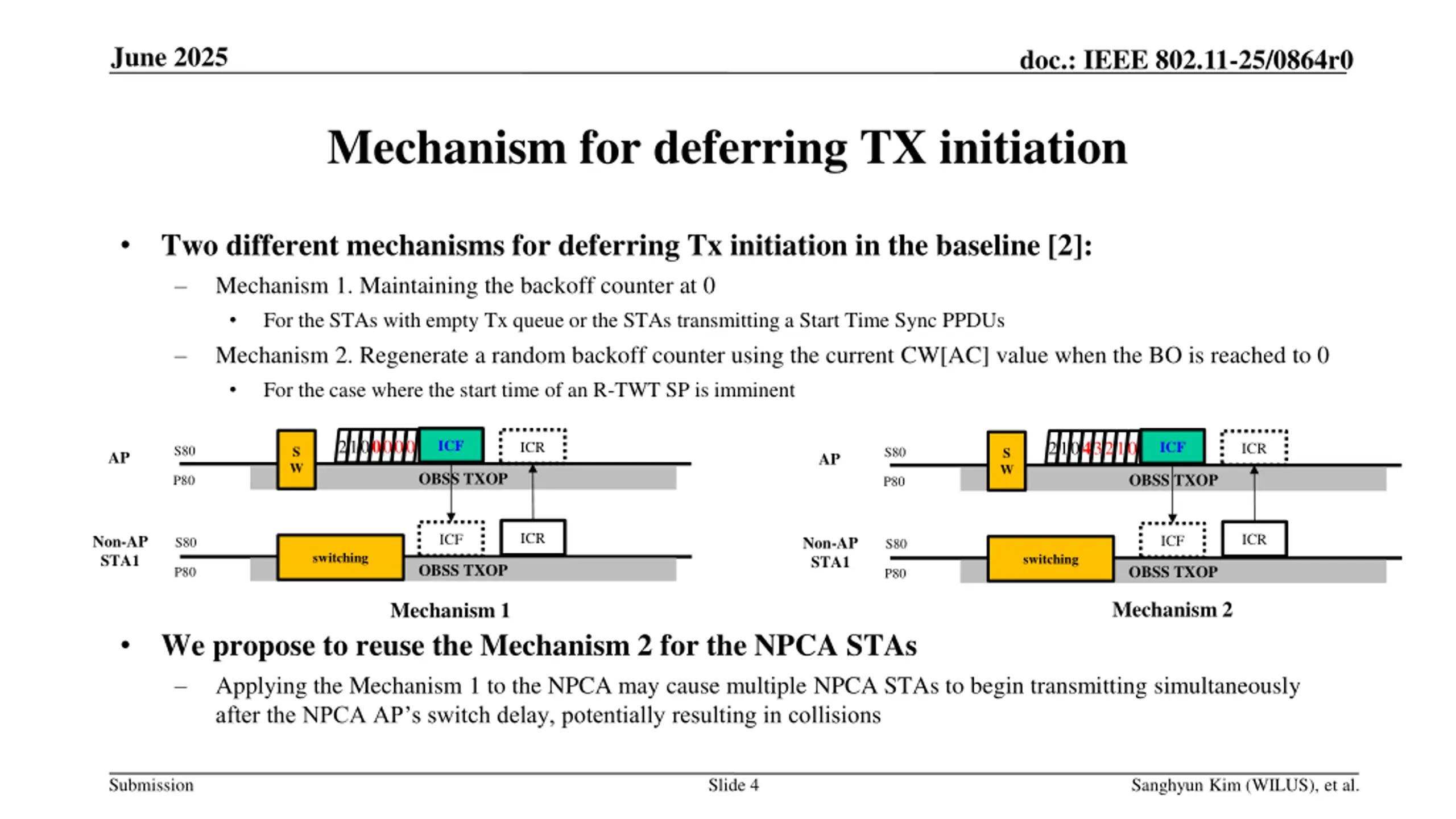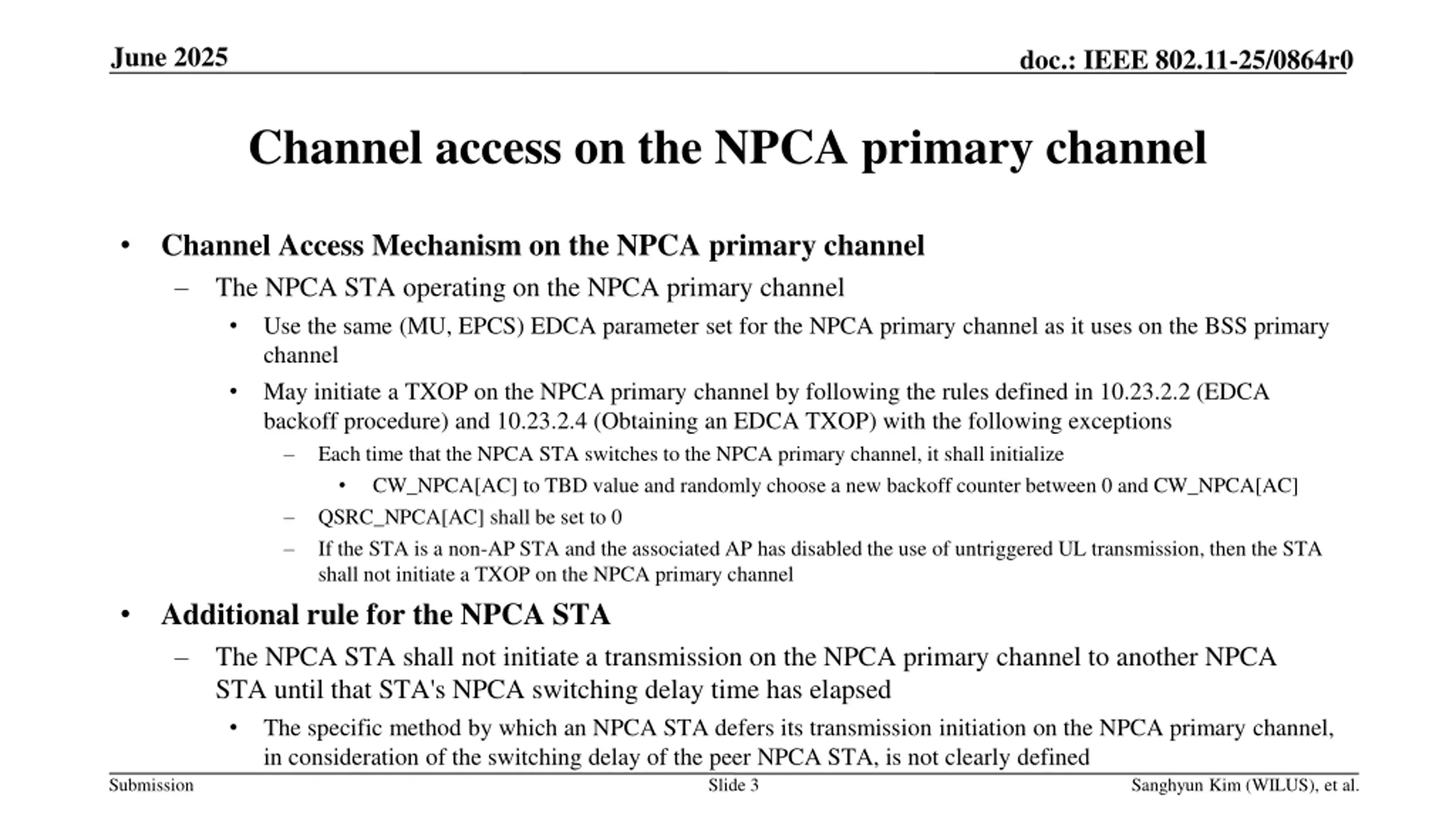 June 2025 doc.: IEEE 802.11-25/0864r0 Channel access on the NPCA primary channel Channel Access Mechanism on the NPCA primary channel The NPCA STA operating on the NPCA primary channel Use the same (MU, EPCS) EDCA parameter set for the NPCA primary channel as it uses on the BSS primary channel May initiate a TXOP on the NPCA primary channel by following the rules defined in 10.23.2.2 (EDCA backoff procedure) and 10.23.2.4 (Obtaining an EDCA TXOP) with the following exceptions Each time that the NPCA STA switches to the NPCA primary channel, it shall initialize CW_NPCA[AC] to TBD value and randomly choose a new backoff counter between 0 and CW_NPCA[AC] QSRC_NPCA[AC] shall be set to 0 If the STA is a non-AP STA and the associated AP has disabled the use of untriggered UL transmission, then the STA shall not initiate a TXOP on the NPCA primary channel Additional rule for the NPCA STA The NPCA STA shall not initiate a transmission on the NPCA primary channel to another NPCA STA until that STA's NPCA switching delay time has elapsed The specific method by which an NPCA STA defers its transmission initiation on the NPCA primary channel, in consideration of the switching delay of the peer NPCA STA, is not clearly defined Submission Slide 3 Sanghyun Kim (WILUS), et al.