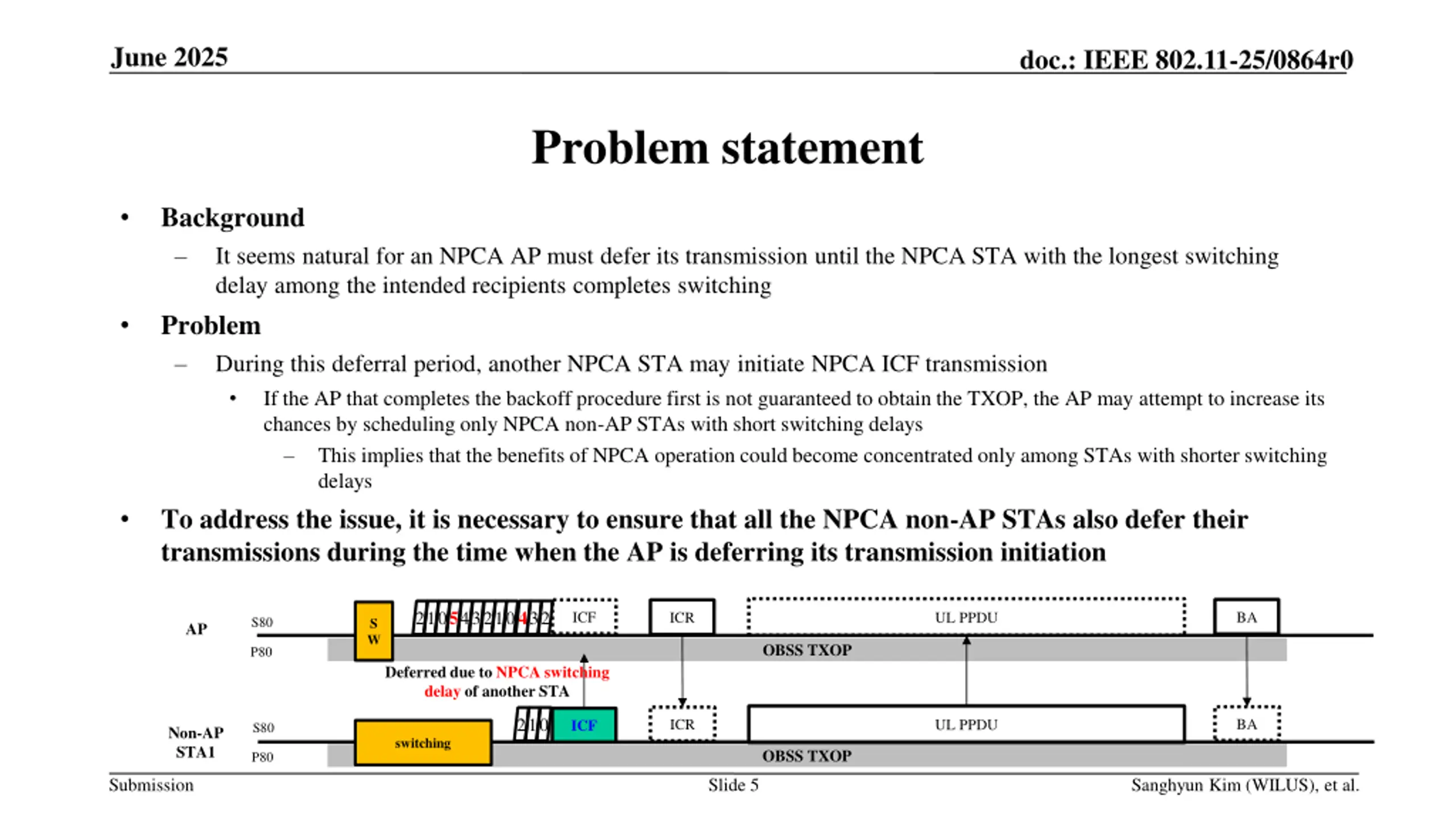 June 2025 doc.: IEEE 802.11-25/0864r0 Problem statement Background It seems natural for an NPCA AP must defer its transmission until the NPCA STA with the longest switching delay among the intended recipients completes switching Problem During this deferral period, another NPCA STA may initiate NPCA ICF transmission If the AP that completes the backoff procedure first is not guaranteed to obtain the TXOP, the AP may attempt to increase its chances by scheduling only NPCA non-AP STAs with short switching delays This implies that the benefits of NPCA operation could become concentrated only among STAs with shorter switching delays To address the issue, it is necessary to ensure that all the NPCA non-AP STAs also defer their transmissions during the time when the AP is deferring its transmission initiation 543210432 210 BA ICF UL PPDU ICR S80 S W AP OBSS TXOP P80 Deferred due to NPCA switching delay of another STA 210 BA ICR UL PPDU ICF S80 Non-AP STA1 switching OBSS TXOP P80 Submission Slide 5 Sanghyun Kim (WILUS), et al.