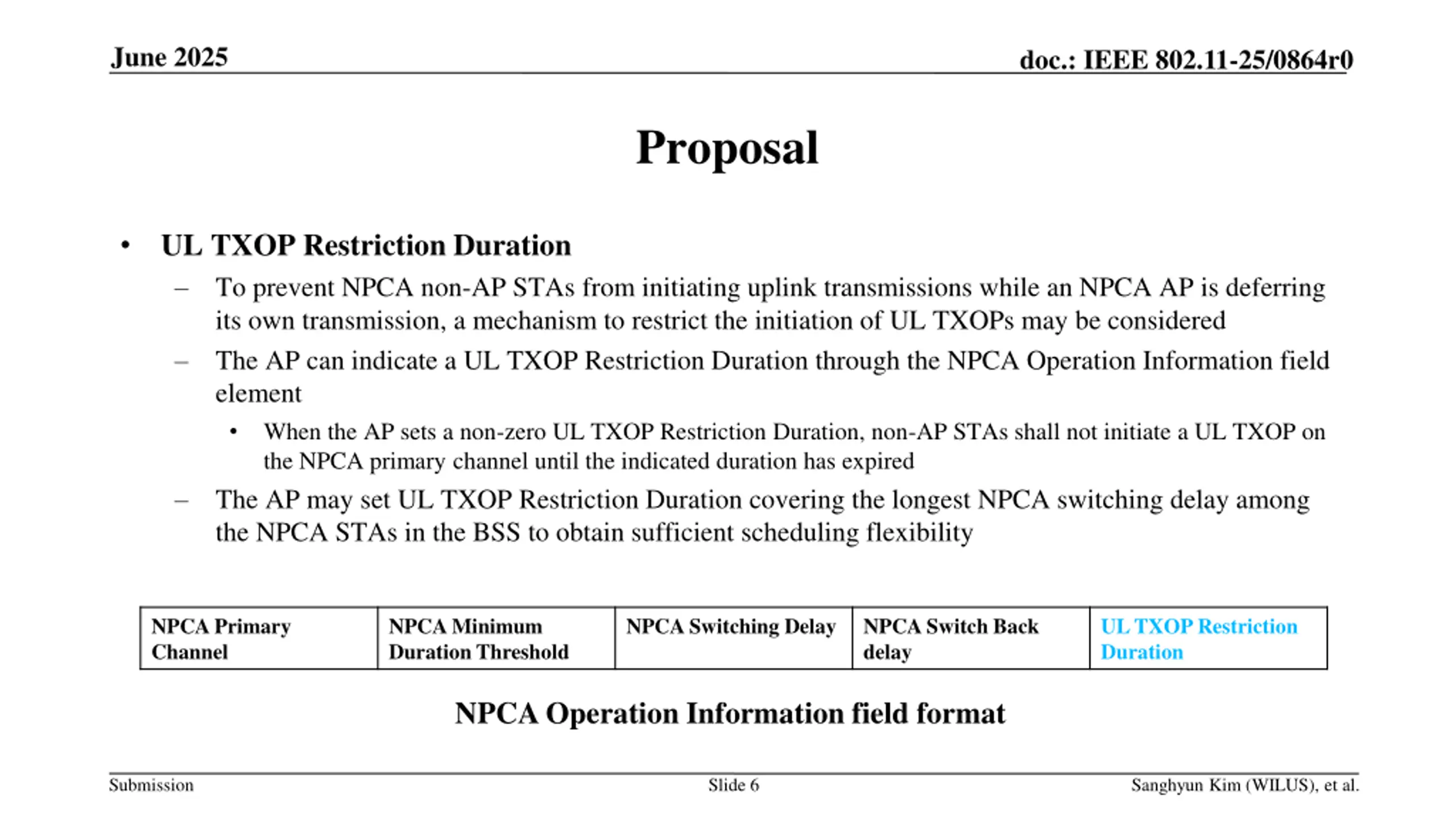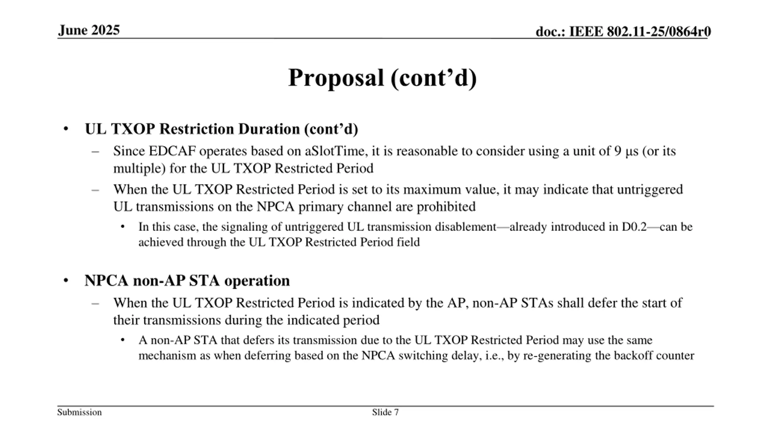 June 2025 doc.: IEEE 802.11-25/0864r0 Proposal UL TXOP Restriction Duration To prevent NPCA non-AP STAs from initiating uplink transmissions while an NPCA AP is deferring its own transmission, a mechanism to restrict the initiation of UL TXOPs may be considered The AP can indicate a UL TXOP Restriction Duration through the NPCA Operation Information field element When the AP sets a non-zero UL TXOP Restriction Duration, non-AP STAs shall not initiate a UL TXOP on the NPCA primary channel until the indicated duration has expired The AP may set UL TXOP Restriction Duration covering the longest NPCA switching delay among the NPCA STAs in the BSS to obtain sufficient scheduling flexibility NPCA Primary Channel NPCA Minimum Duration Threshold NPCA Switching Delay NPCA Switch Back delay UL TXOP Restriction Duration NPCA Operation Information field format Submission Slide 6 Sanghyun Kim (WILUS), et al.