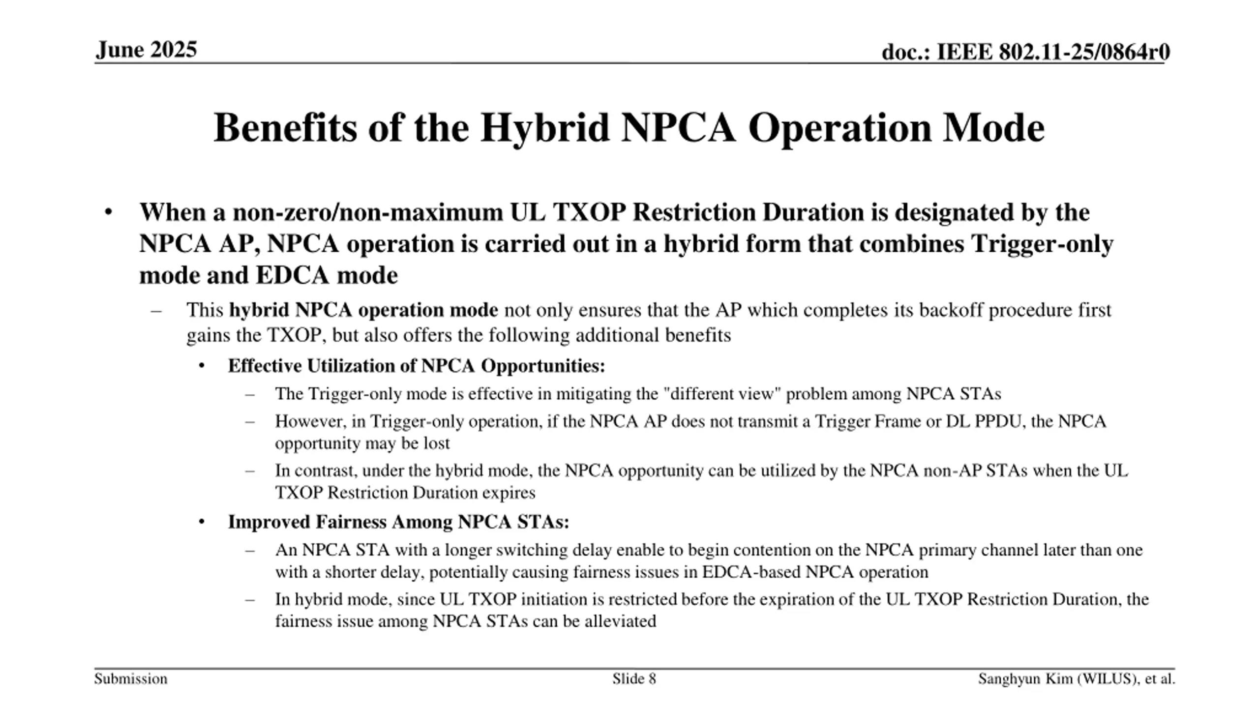 June 2025 doc.: IEEE 802.11-25/0864r0 Benefits of the Hybrid NPCA Operation Mode When a non-zero/non-maximum UL TXOP Restriction Duration is designated by the NPCA AP, NPCA operation is carried out in a hybrid form that combines Trigger-only mode and EDCA mode This hybrid NPCA operation mode not only ensures that the AP which completes its backoff procedure first gains the TXOP, but also offers the following additional benefits Effective Utilization of NPCA Opportunities: The Trigger-only mode is effective in mitigating the "different view" problem among NPCA STAs However, in Trigger-only operation, if the NPCA AP does not transmit a Trigger Frame or DL PPDU, the NPCA opportunity may be lost In contrast, under the hybrid mode, the NPCA opportunity can be utilized by the NPCA non-AP STAs when the UL TXOP Restriction Duration expires Improved Fairness Among NPCA STAs: An NPCA STA with a longer switching delay enable to begin contention on the NPCA primary channel later than one with a shorter delay, potentially causing fairness issues in EDCA-based NPCA operation In hybrid mode, since UL TXOP initiation is restricted before the expiration of the UL TXOP Restriction Duration, the fairness issue among NPCA STAs can be alleviated Submission Slide 8 Sanghyun Kim (WILUS), et al.