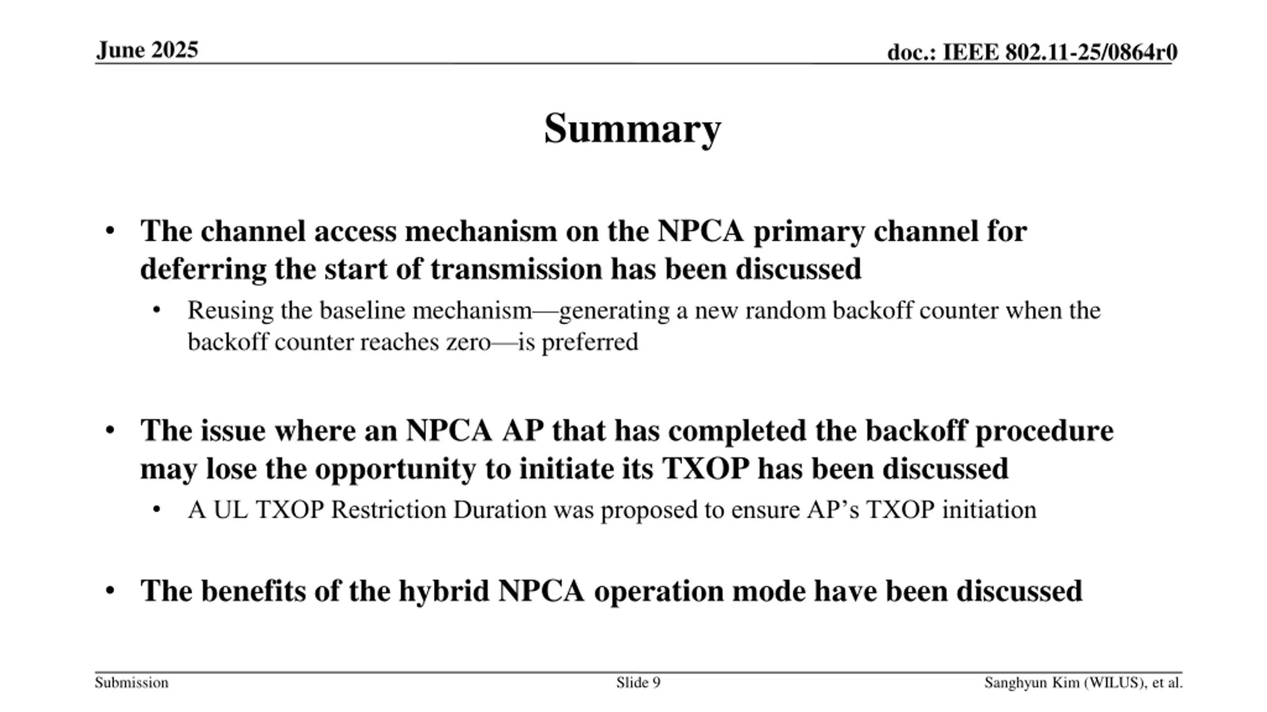 June 2025 doc.: IEEE 802.11-25/0864r0 Summary The channel access mechanism on the NPCA primary channel for deferring the start of transmission has been discussed Reusing the baseline mechanism generating a new random backoff counter when the backoff counter reaches zero is preferred The issue where an NPCA AP that has completed the backoff procedure may lose the opportunity to initiate its TXOP has been discussed A UL TXOP Restriction Duration was proposed to ensure AP s TXOP initiation The benefits of the hybrid NPCA operation mode have been discussed Submission Slide 9 Sanghyun Kim (WILUS), et al.