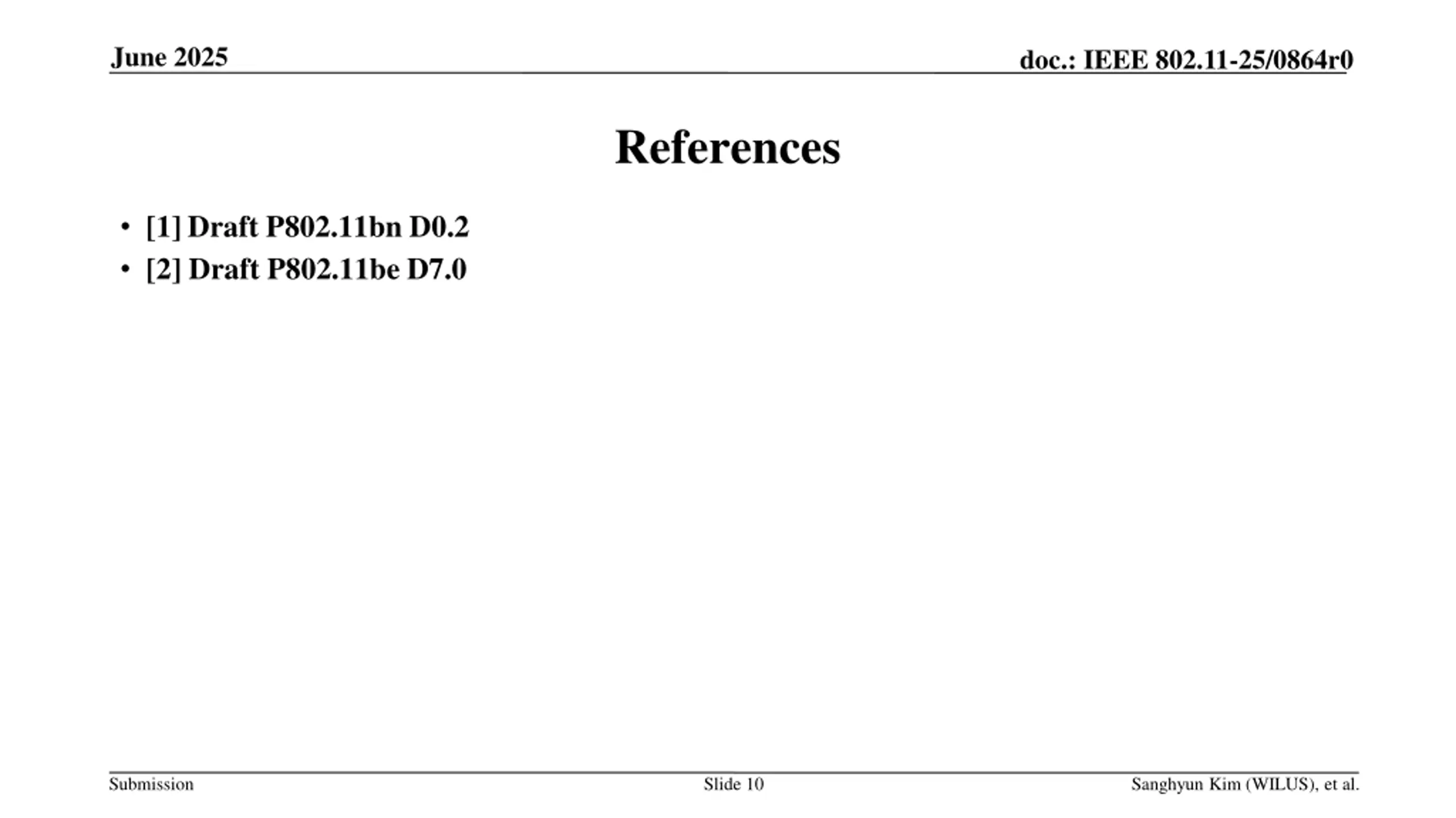June 2025 doc.: IEEE 802.11-25/0864r0 References [1] Draft P802.11bn D0.2 [2] Draft P802.11be D7.0 Submission Slide 10 Sanghyun Kim (WILUS), et al.