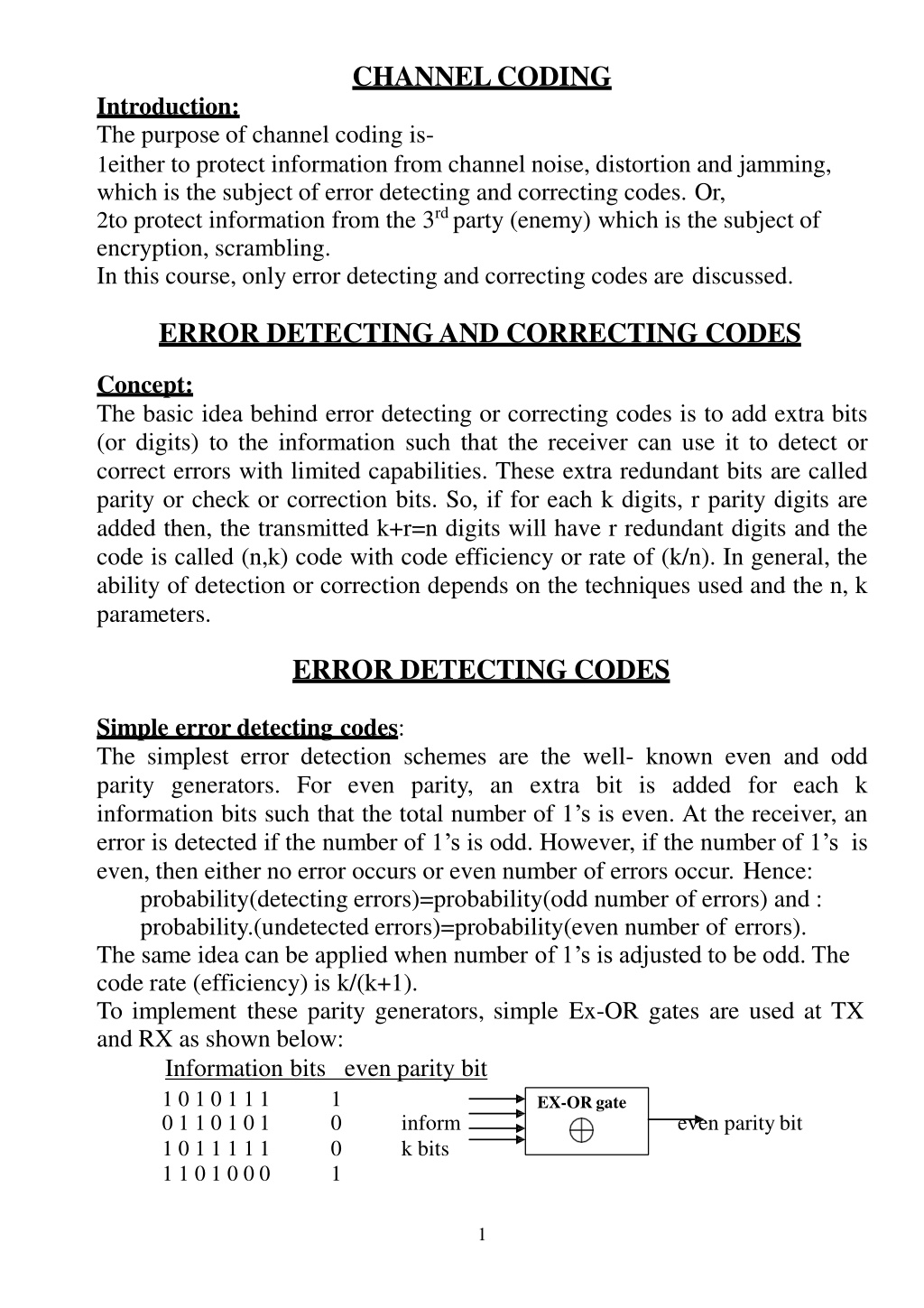 CHANNEL CODING Introduction: The purpose of channel coding is- 1either to protect information from channel noise, distortion and jamming, which is the subject of error detecting and correcting codes. Or, 2to protect information from the 3rd party (enemy) which is the subject of encryption, scrambling. In this course, only error detecting and correcting codes are discussed. ERROR DETECTING AND CORRECTING CODES Concept: The basic idea behind error detecting or correcting codes is to add extra bits (or digits) to the information such that the receiver can use it to detect or correct errors with limited capabilities. These extra redundant bits are called parity or check or correction bits. So, if for each k digits, r parity digits are added then, the transmitted k+r=n digits will have r redundant digits and the code is called (n,k) code with code efficiency or rate of (k/n). In general, the ability of detection or correction depends on the techniques used and the n, k parameters. ERROR DETECTING CODES Simple error detecting codes: The simplest error detection schemes are the well- known even and odd parity generators. For even parity, an extra bit is added for each k information bits such that the total number of 1 s is even. At the receiver, an error is detected if the number of 1 s is odd. However, if the number of 1 s is even, then either no error occurs or even number of errors occur. Hence: probability(detecting errors)=probability(odd number of errors) and : probability.(undetected errors)=probability(even number of errors). The same idea can be applied when number of 1 s is adjusted to be odd. The code rate (efficiency) is k/(k+1). To implement these parity generators, simple Ex-OR gates are used at TX and RX as shown below: Information bits even parity bit 1 0 1 0 1 1 1 1 0 1 1 0 1 0 1 0 inform 1 0 1 1 1 1 1 0 k bits 1 1 0 1 0 0 0 1 EX-OR gate even paritybit 1