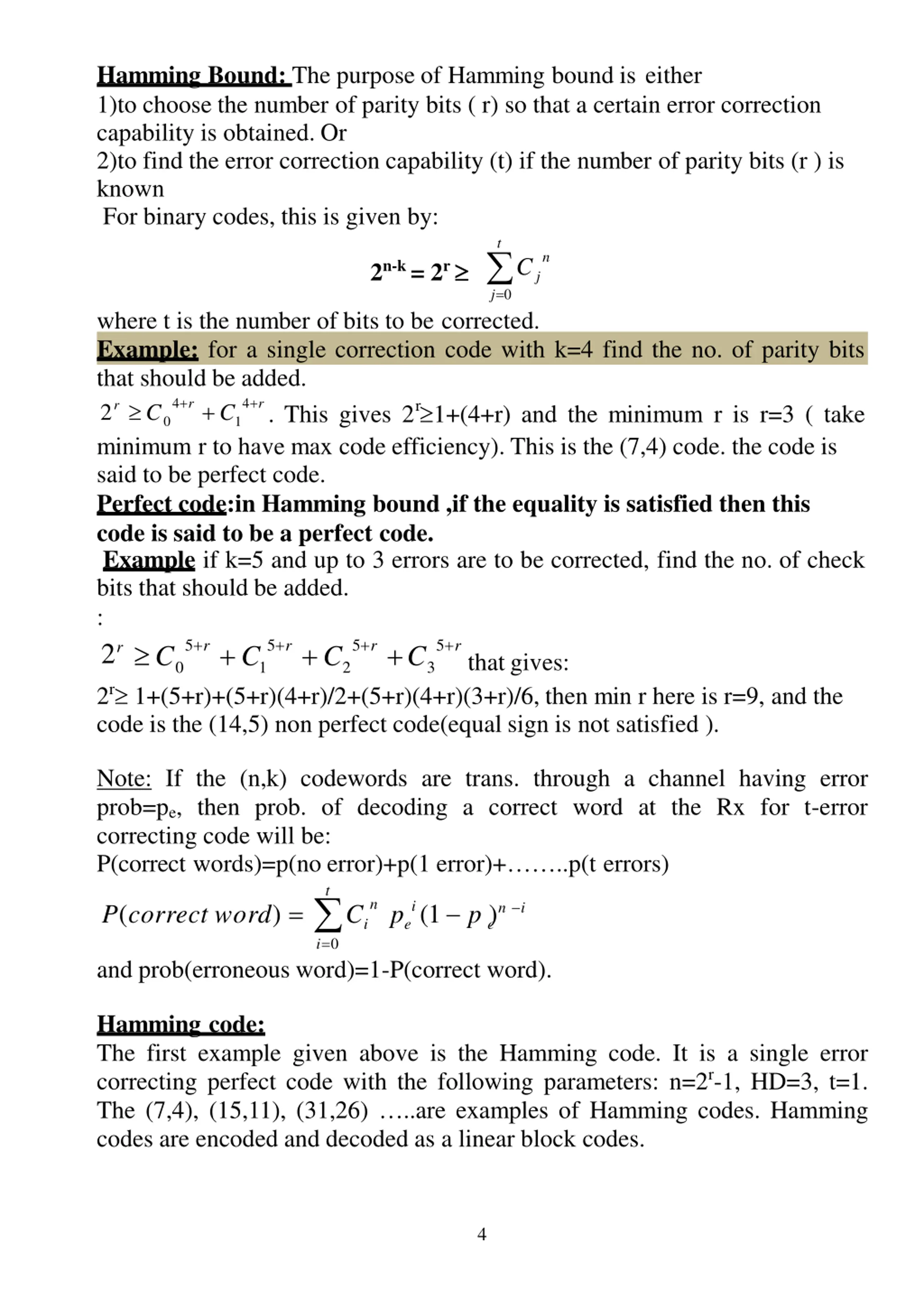Hamming Bound: The purpose of Hamming bound is either 1)to choose the number of parity bits ( r) so that a certain error correction capability is obtained. Or 2)to find the error correction capability (t) if the number of parity bits (r ) is known For binary codes, this is given by: t 2n-k = 2r n C j j=0 where t is the number of bits to be corrected. Example: for a single correction code with k=4 find the no. of parity bits that should be added. r +C 0 1 2 C . This gives 2 1+(4+r) and the minimum r is r=3 ( take minimum r to have max code efficiency). This is the (7,4) code. the code is said to be perfect code. Perfect code:in Hamming bound ,if the equality is satisfied then this code is said to be a perfect code. Example if k=5 and up to 3 errors are to be corrected, find the no. of check bits that should be added. : +C +C +C C 0 1 2 3 2r that gives: 2r 1+(5+r)+(5+r)(4+r)/2+(5+r)(4+r)(3+r)/6, then min r here is r=9, and the code is the (14,5) non perfect code(equal sign is not satisfied ). 4+r 4+r r 5+r 5+r 5+r 5+r Note: If the (n,k) codewords are trans. through a channel having error prob=pe, then prob. of decoding a correct word at the Rx for t-error correcting code will be: P(correct words)=p(no error)+p(1 error)+ ..p(t errors) t n i e i=0 and prob(erroneous word)=1-P(correct word). P(correct word) = p i (1 p )n i C e Hamming code: The first example given above is the Hamming code. It is a single error correcting perfect code with the following parameters: n=2r-1, HD=3, t=1. The (7,4), (15,11), (31,26) ..are examples of Hamming codes. Hamming codes are encoded and decoded as a linear block codes. 4