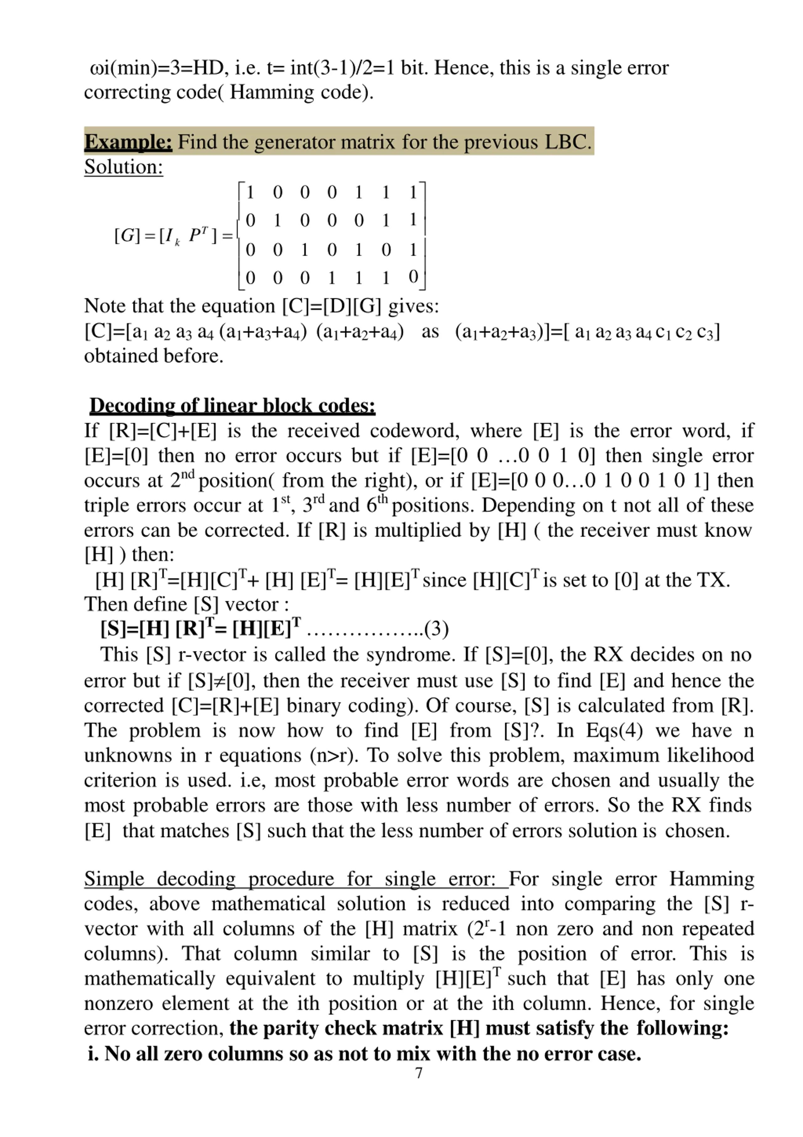 i(min)=3=HD, i.e. t= int(3-1)/2=1 bit. Hence, this is a single error correcting code( Hamming code). Example: Find the generator matrix for the previous LBC. Solution: 1 0 0 0 0 1 0 0 0 0 1 0 0 0 0 1 Note that the equation [C]=[D][G] gives: [C]=[a1a2a3a4(a1+a3+a4) (a1+a2+a4) as obtained before. 1 1 0 1 1 1 1 0 1 1 1 [G] =[I PT ] = k 0 (a1+a2+a3)]=[ a1 a2 a3 a4 c1 c2c3] Decoding of linear block codes: If [R]=[C]+[E] is the received codeword, where [E] is the error word, if [E]=[0] then no error occurs but if [E]=[0 0 0 0 1 0] then single error occurs at 2ndposition( from the right), or if [E]=[0 0 0 0 1 0 0 1 0 1] then triple errors occur at 1st, 3rdand 6thpositions. Depending on t not all of these errors can be corrected. If [R] is multiplied by [H] ( the receiver must know [H] ) then: [H] [R]T=[H][C]T+ [H] [E]T= [H][E]T since [H][C]T is set to [0] at the TX. Then define [S] vector : [S]=[H] [R]T= [H][E]T ..(3) This [S] r-vector is called the syndrome. If [S]=[0], the RX decides on no error but if [S] [0], then the receiver must use [S] to find [E] and hence the corrected [C]=[R]+[E] binary coding). Of course, [S] is calculated from [R]. The problem is now how to find [E] from [S]?. In Eqs(4) we have n unknowns in r equations (n>r). To solve this problem, maximum likelihood criterion is used. i.e, most probable error words are chosen and usually the most probable errors are those with less number of errors. So the RX finds [E] that matches [S] such that the less number of errors solution is chosen. Simple decoding procedure for single error: For single error Hamming codes, above mathematical solution is reduced into comparing the [S] r- vector with all columns of the [H] matrix (2r-1 non zero and non repeated columns). That column similar to [S] is the position of error. This is mathematically equivalent to multiply [H][E]Tsuch that [E] has only one nonzero element at the ith position or at the ith column. Hence, for single error correction, the parity check matrix [H] must satisfy the following: i. No all zero columns so as not to mix with the no error case. 7