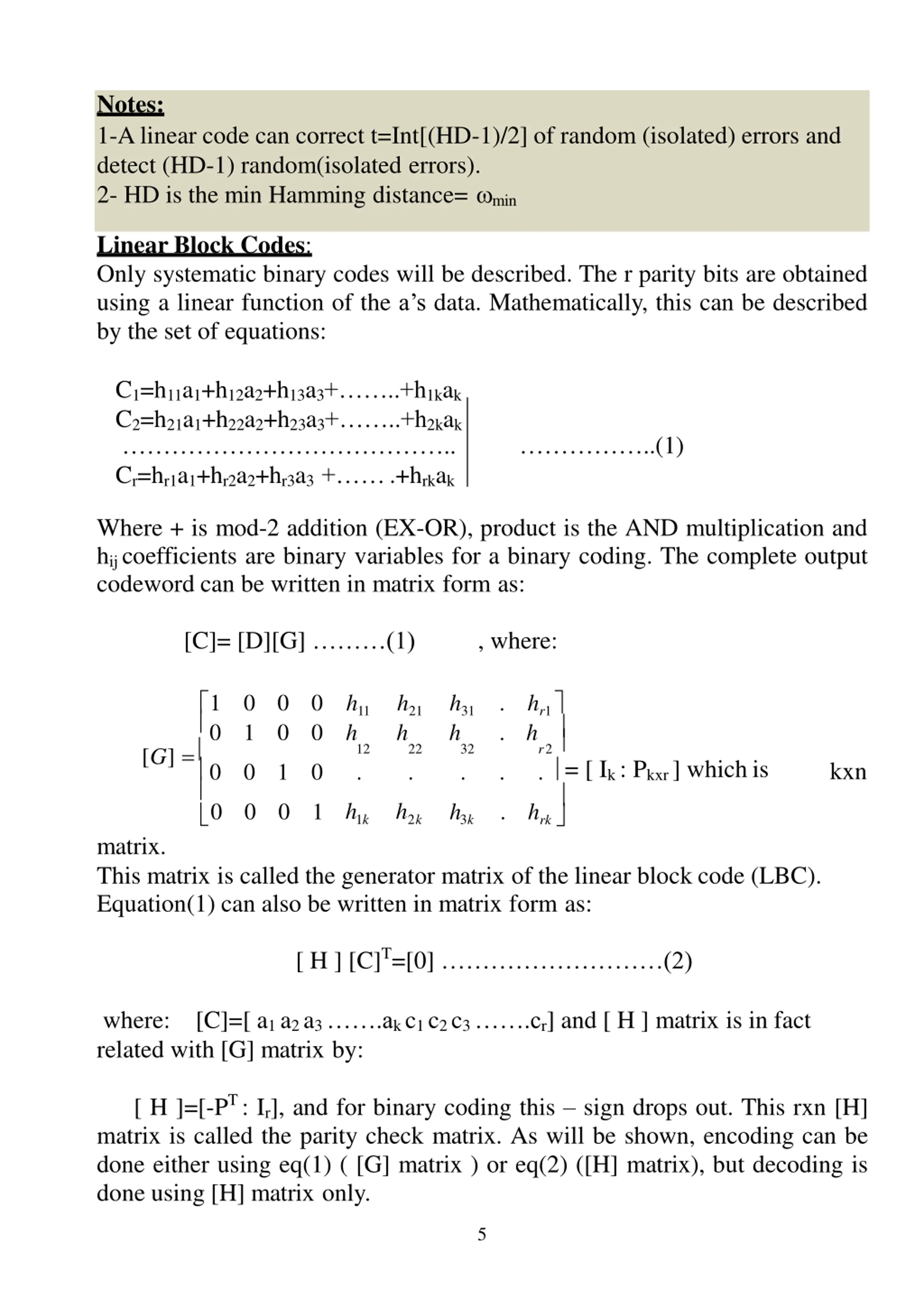 Basic definitions: 1systematic and nonsystematic codes: If information bits ( a s) are unchanged in their values and positions at the transmitted codeword, then this code is said to be systematic. Input data [D]=[a1 a2 a3 .ak], Output systematic (n,k) codeword is [C]=[ a1a2a3 .akc1c2c3 .cr] However if data bits are spread or changed at the output codeword then, the code is said to be nonsystematic: Output nonsystematic(7,4) codeword is [C]=[c2 a1 c3 a2 c1 a4a3] 2Hamming distance: it is the number of differences between corresponding bits and the ability of error detection and correction codes depends on this parameter. The Hamming distance between two codewords denoted by dijwhich is the number of bits that differ. For a binary (n,k) code with 2kpossible codewords then the minimum Hamming distance (HD) is the min(dij). Of course n dij 0. Ciand Cjis Example: Find the Hamming distance between the two codewords: [C1]=[1011100] and [C2]=[1011001]. Solution: Here, the no. of bits that differ is 2, hence d12=2. Example: Find the minimum Hamming distance for the 3 codewords: [C1]=[1011100], [C2]=[1011001] [C3]=[1011000]. Solution: Here d12=2, d13=1 and d23=1. Hence min(dij)=1=(HD). Note that the calculation of HD becomes more difficult if no of codewords increases. 3Hamming weight: This is the number of 1 s in the non zero codeward Ci. It is denoted by i. As will be shown later, and for linear codes, min=HD=min(dij). This simplifies the calculation of HD. As an example, if [C1]=[1011000], then 1=3, and for [C2]=[0001010], then 2=2, and so on. 4Linear and nonlinear codes: when the r parity bits are obtained from a linear function of the k information bits then the code is said to be linear, otherwise it is a nonlinear code. 3