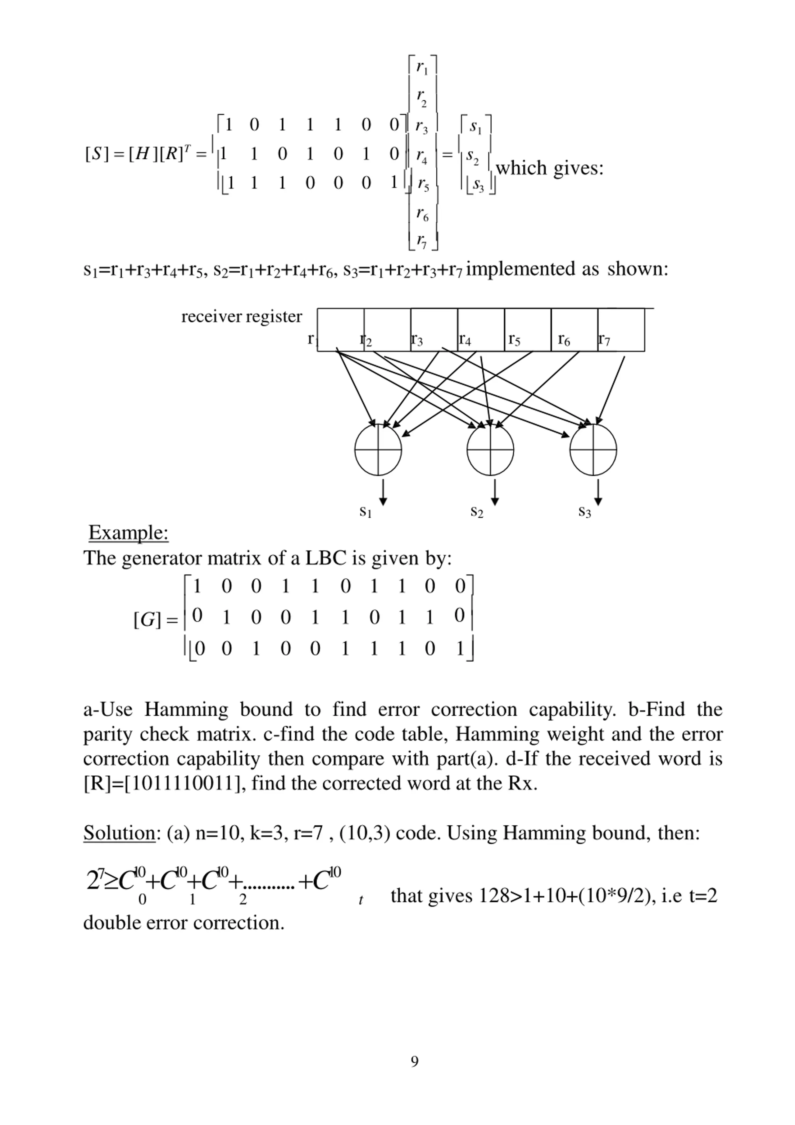 r1 r 2 0 r3 0 r = s 1 0 s1 1 0 1 1 1 0 1 0 0 0 1 0 [S] = [H][R]T= 1 1 4 1 r5 1 1 2 which gives: s3 r6 7 r s1=r1+r3+r4+r5, s2=r1+r2+r4+r6, s3=r1+r2+r3+r7 implemented as shown: receiver register r1 r2 r3 r4 r5 r6 r7 s1 s2 s3 Example: The generator matrix of a LBC is given by: 1 0 0 0 0 0 1 0 1 0 0 1 1 0 0 1 1 0 0 1 1 0 1 0 1 1 1 1 1 0 [G] = a-Use Hamming bound to find error correction capability. b-Find the parity check matrix. c-find the code table, Hamming weight and the error correction capability then compare with part(a). d-If the received word is [R]=[1011110011], find the corrected word at the Rx. Solution: (a) n=10, k=3, r=7 , (10,3) code. Using Hamming bound, then: 27 C 10 +C 10 +C 10 +........... +C10 0 1 double error correction. that gives 128>1+10+(10*9/2), i.e t=2 2 t 9