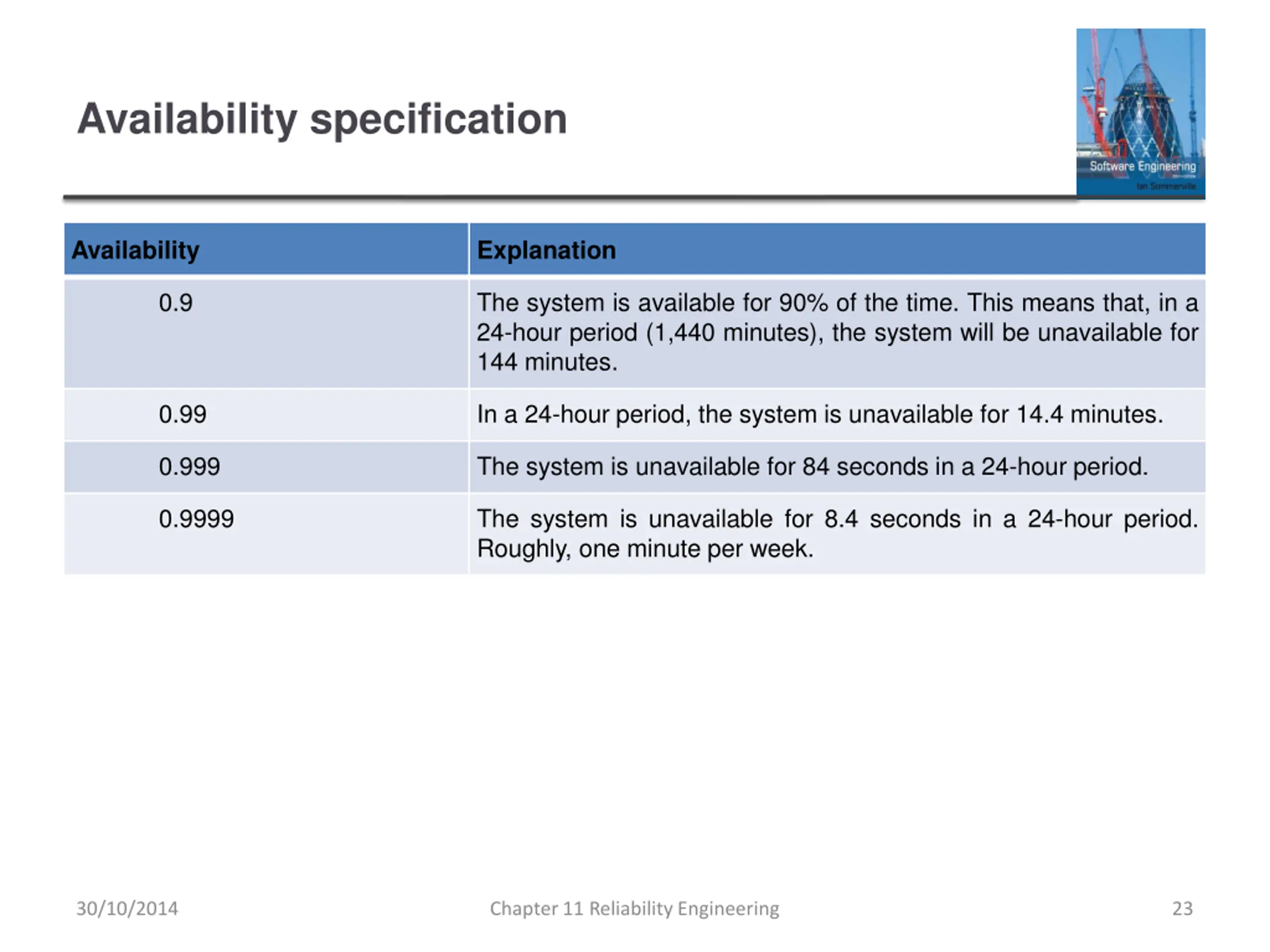 Availability specification Availability Explanation 0.9 The system is available for 90% of the time. This means that, in a 24-hour period (1,440 minutes), the system will be unavailable for 144 minutes. 0.99 In a 24-hour period, the system is unavailable for 14.4 minutes. 0.999 The system is unavailable for 84 seconds in a 24-hour period. 0.9999 The system is unavailable for 8.4 seconds in a 24-hour period. Roughly, one minute per week. 30/10/2014 Chapter 11 Reliability Engineering 23