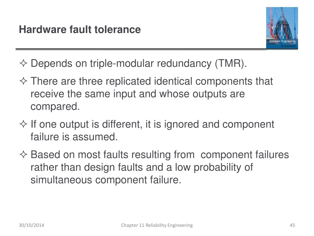 N-version programming Multiple versions of a software system carry out computations at the same time. There should be an odd number of computers involved, typically 3. The results are compared using a voting system and the majority result is taken to be the correct result. Approach derived from the notion of triple-modular redundancy, as used in hardware systems. 30/10/2014 Chapter 11 Reliability Engineering 44