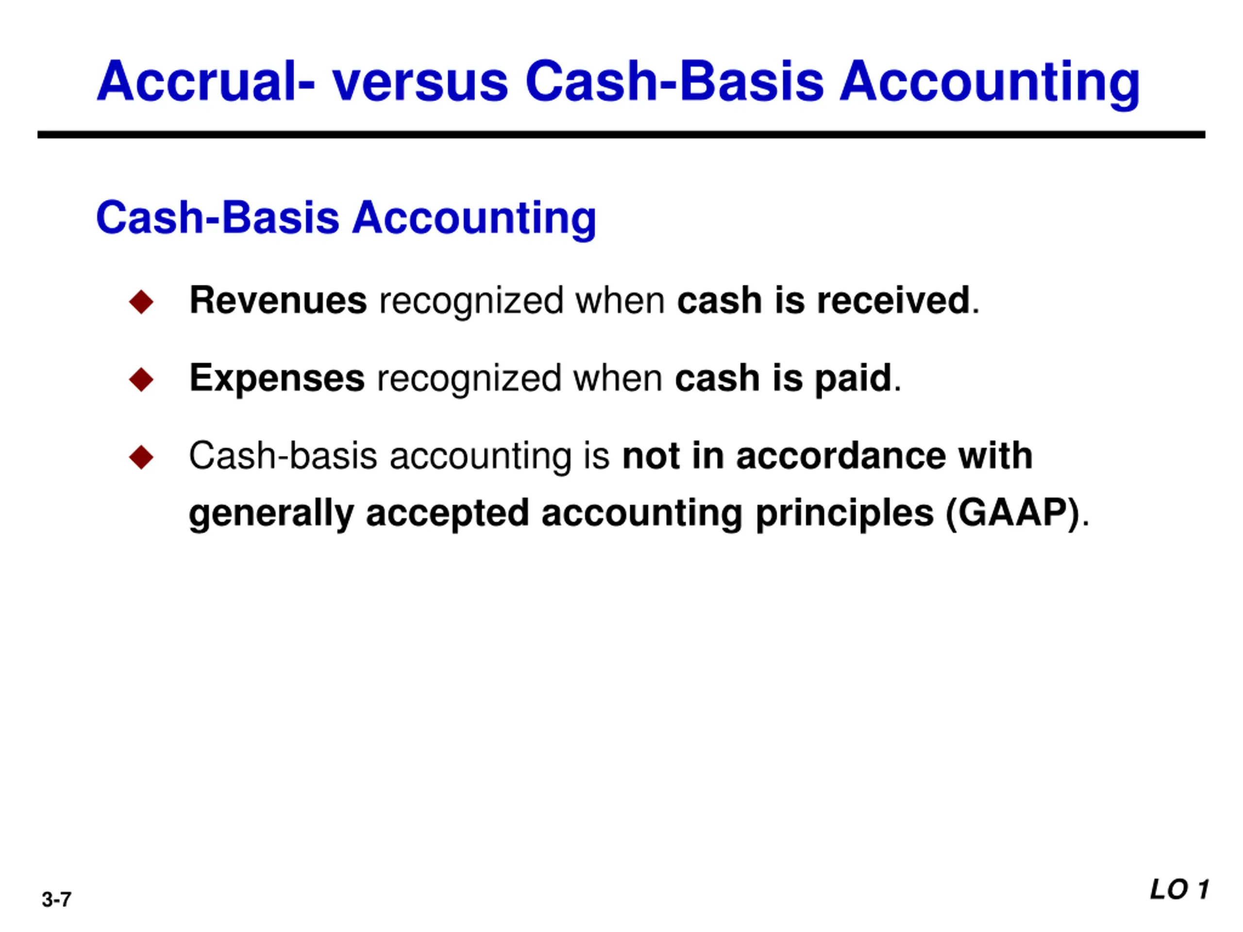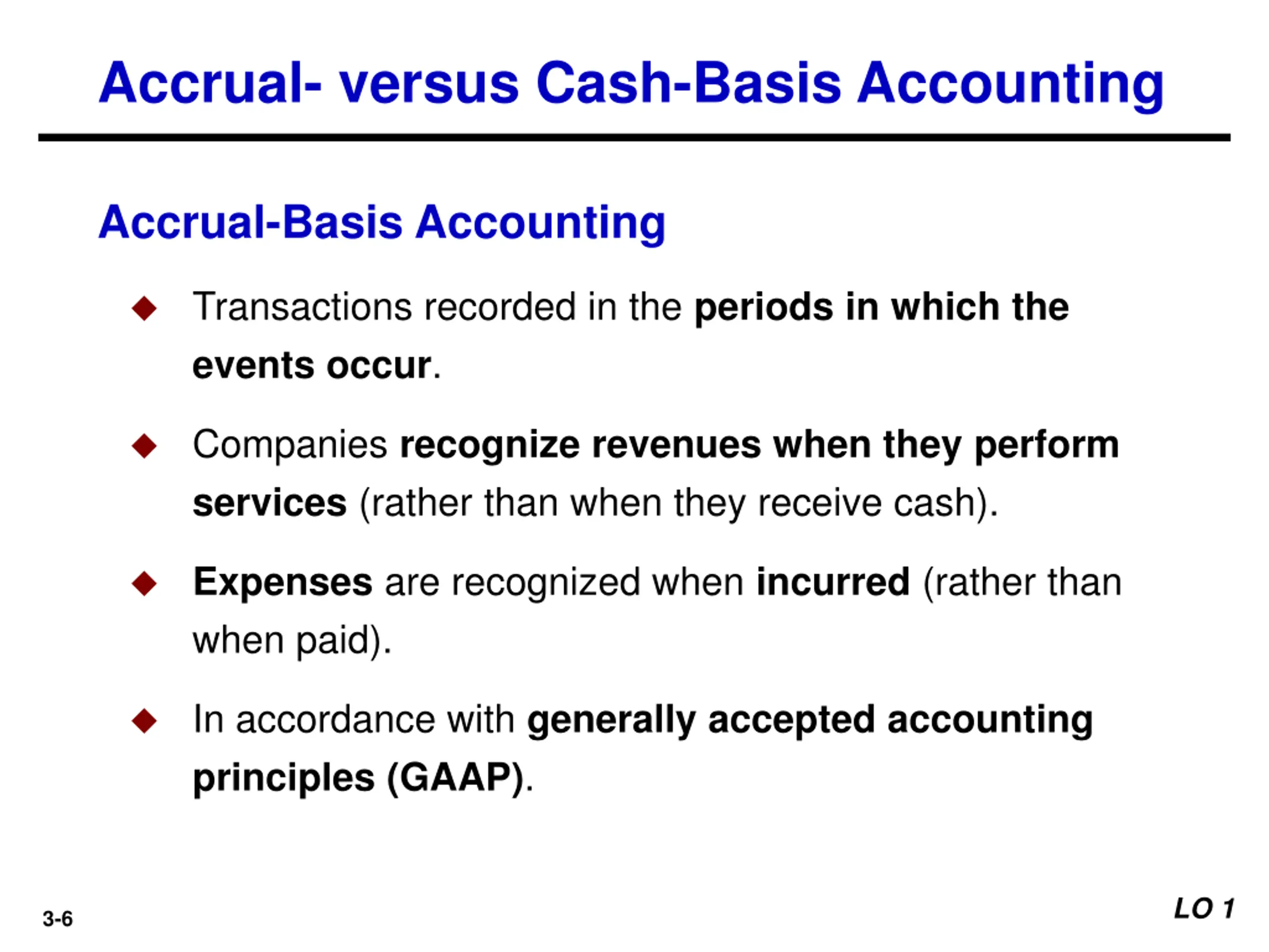 Accrual- versus Cash-Basis Accounting Accrual-Basis Accounting Transactions recorded in the periods in which the events occur. Companies recognizerevenues when theyperform services (rather than when they receive cash). Expenses are recognized when incurred (rather than when paid). In accordance with generally accepted accounting principles (GAAP). LO 1 3-6