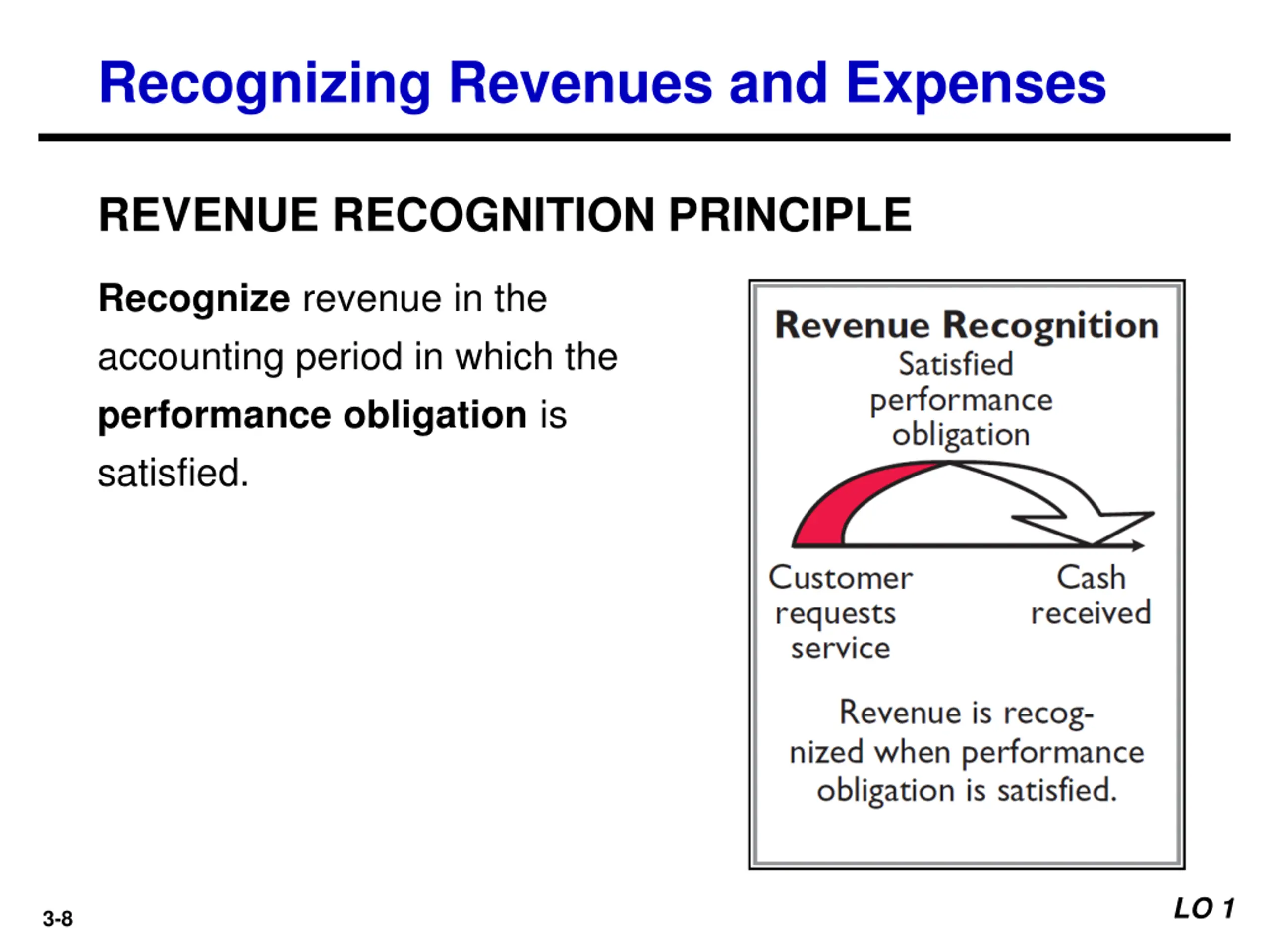 Recognizing Revenues and Expenses REVENUE RECOGNITION PRINCIPLE Recognize revenue in the accounting period in which the performance obligation is satisfied. LO 1 3-8