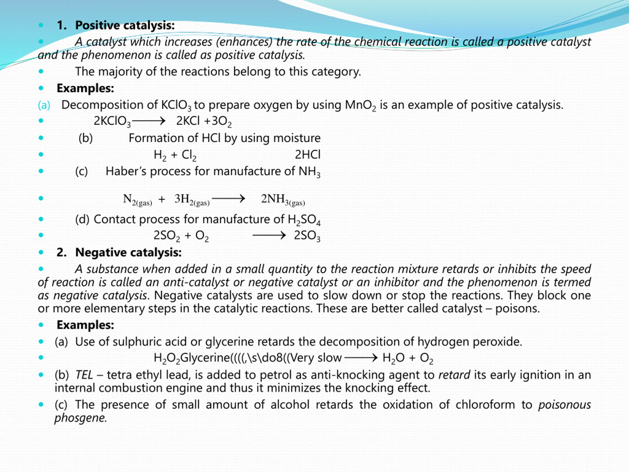 1. Positive catalysis: A catalyst which increases (enhances) the rate of the chemical reaction is called a positive catalyst and the phenomenon is called as positive catalysis. The majority of the reactions belong to this category. Examples: (a) Decomposition of KClO3 to prepare oxygen by using MnO2 is an example of positive catalysis. (b) Formation of HCl by using moisture H2 + Cl2 2HCl (c) Haber s process for manufacture of NH3 N2(gas) + 3H2(gas) 2NH3(gas) (d) Contact process for manufacture of H2SO4 2SO2 + O2 2SO3 2. Negative catalysis: A substance when added in a small quantity to the reaction mixture retards or inhibits the speed of reaction is called an anti-catalyst or negative catalyst or an inhibitor and the phenomenon is termed as negative catalysis. Negative catalysts are used to slow down or stop the reactions. They block one or more elementary steps in the catalytic reactions. These are better called catalyst poisons. Examples: (a) Use of sulphuric acid or glycerine retards the decomposition of hydrogen peroxide. (b) TEL tetra ethyl lead, is added to petrol as anti-knocking agent to retard its early ignition in an internal combustion engine and thus it minimizes the knocking effect. (c) The presence of small amount of alcohol retards the oxidation of chloroform to poisonous phosgene. 2KClO3 2KCl +3O2 H2O2Glycerine((((,\s\do8((Very slow H2O + O2