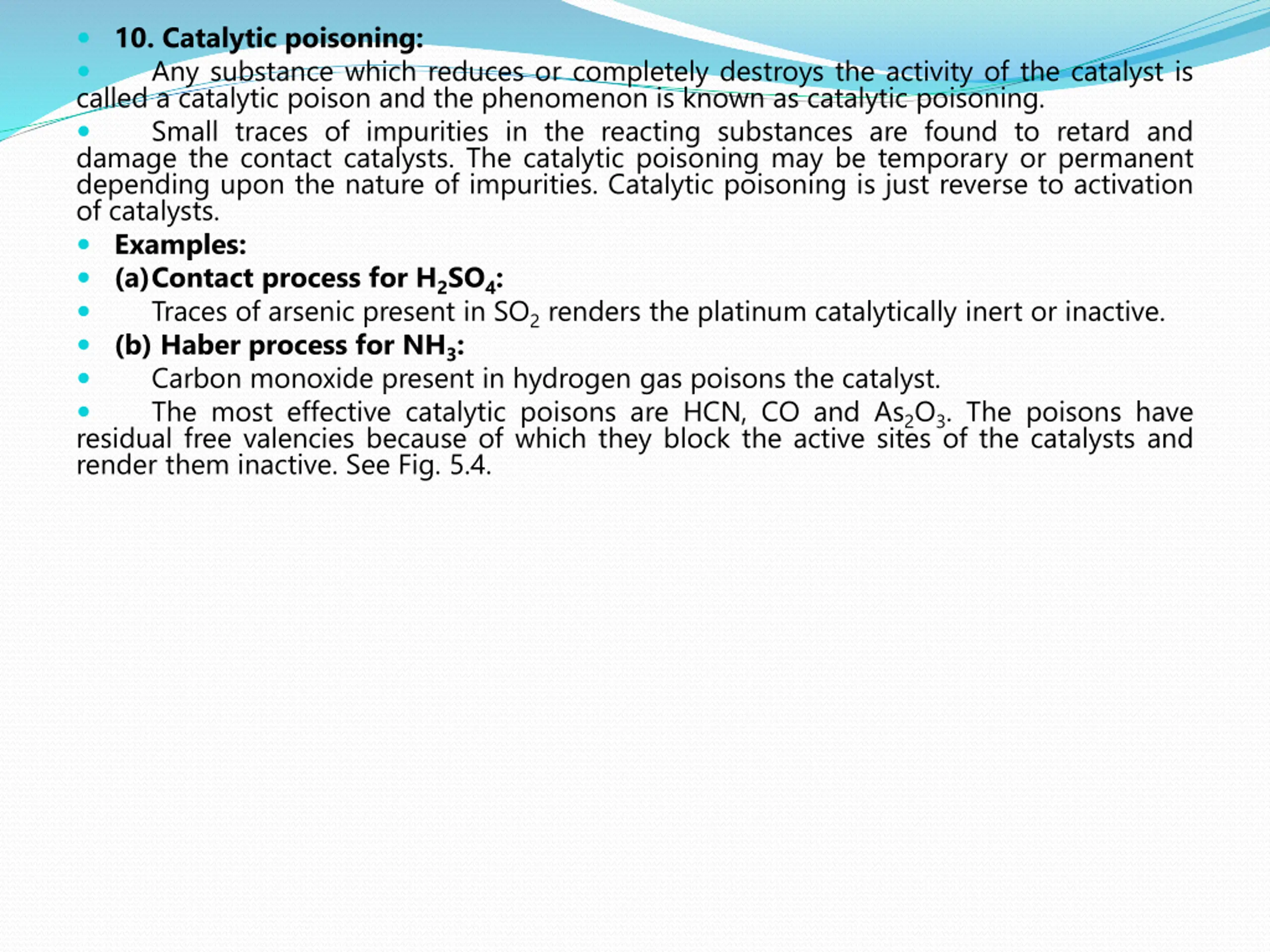 10. Catalytic poisoning: Any substance which reduces or completely destroys the activity of the catalyst is called a catalytic poison and the phenomenon is known as catalytic poisoning. Small traces of impurities in the reacting substances are found to retard and damage the contact catalysts. The catalytic poisoning may be temporary or permanent depending upon the nature of impurities. Catalytic poisoning is just reverse to activation of catalysts. Examples: (a) Contact process for H2SO4: Traces of arsenic present in SO2 renders the platinum catalytically inert or inactive. (b) Haber process for NH3: Carbon monoxide present in hydrogen gas poisons the catalyst. The most effective catalytic poisons are HCN, CO and As2O3. The poisons have residual free valencies because of which they block the active sites of the catalysts and render them inactive. See Fig. 5.4.