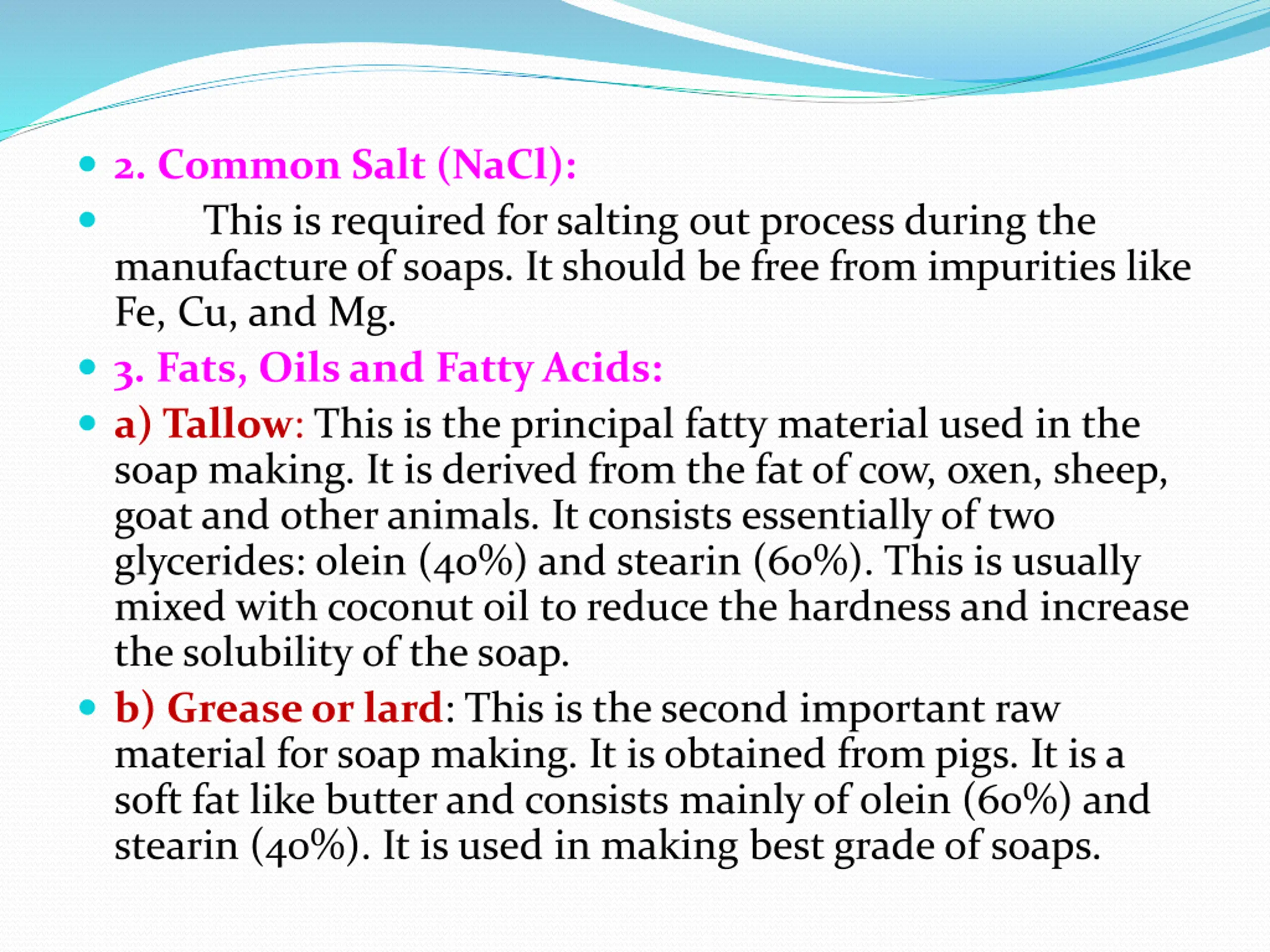 2. Common Salt (NaCl): This is required for salting out process during the manufacture of soaps. It should be free from impurities like Fe, Cu, and Mg. 3. Fats, Oils and Fatty Acids: a) Tallow: This is the principal fatty material used in the soap making. It is derived from the fat of cow, oxen, sheep, goat and other animals. It consists essentially of two glycerides: olein (40%) and stearin (60%). This is usually mixed with coconut oil to reduce the hardness and increase the solubility of the soap. b) Grease or lard: This is the second important raw material for soap making. It is obtained from pigs. It is a soft fat like butter and consists mainly of olein (60%) and stearin (40%). It is used in making best grade of soaps.