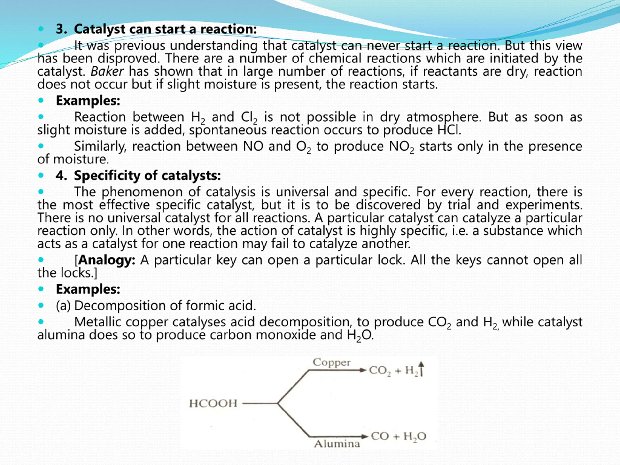 3. Catalyst can start a reaction: It was previous understanding that catalyst can never start a reaction. But this view has been disproved. There are a number of chemical reactions which are initiated by the catalyst. Baker has shown that in large number of reactions, if reactants are dry, reaction does not occur but if slight moisture is present, the reaction starts. Examples: Reaction between H2 and Cl2 is not possible in dry atmosphere. But as soon as slight moisture is added, spontaneous reaction occurs to produce HCl. Similarly, reaction between NO and O2 to produce NO2 starts only in the presence of moisture. 4. Specificity of catalysts: The phenomenon of catalysis is universal and specific. For every reaction, there is the most effective specific catalyst, but it is to be discovered by trial and experiments. There is no universal catalyst for all reactions. A particular catalyst can catalyze a particular reaction only. In other words, the action of catalyst is highly specific, i.e. a substance which acts as a catalyst for one reaction may fail to catalyze another. [Analogy: A particular key can open a particular lock. All the keys cannot open all the locks.] Examples: (a) Decomposition of formic acid. Metallic copper catalyses acid decomposition, to produce CO2 and H2, while catalyst alumina does so to produce carbon monoxide and H2O.