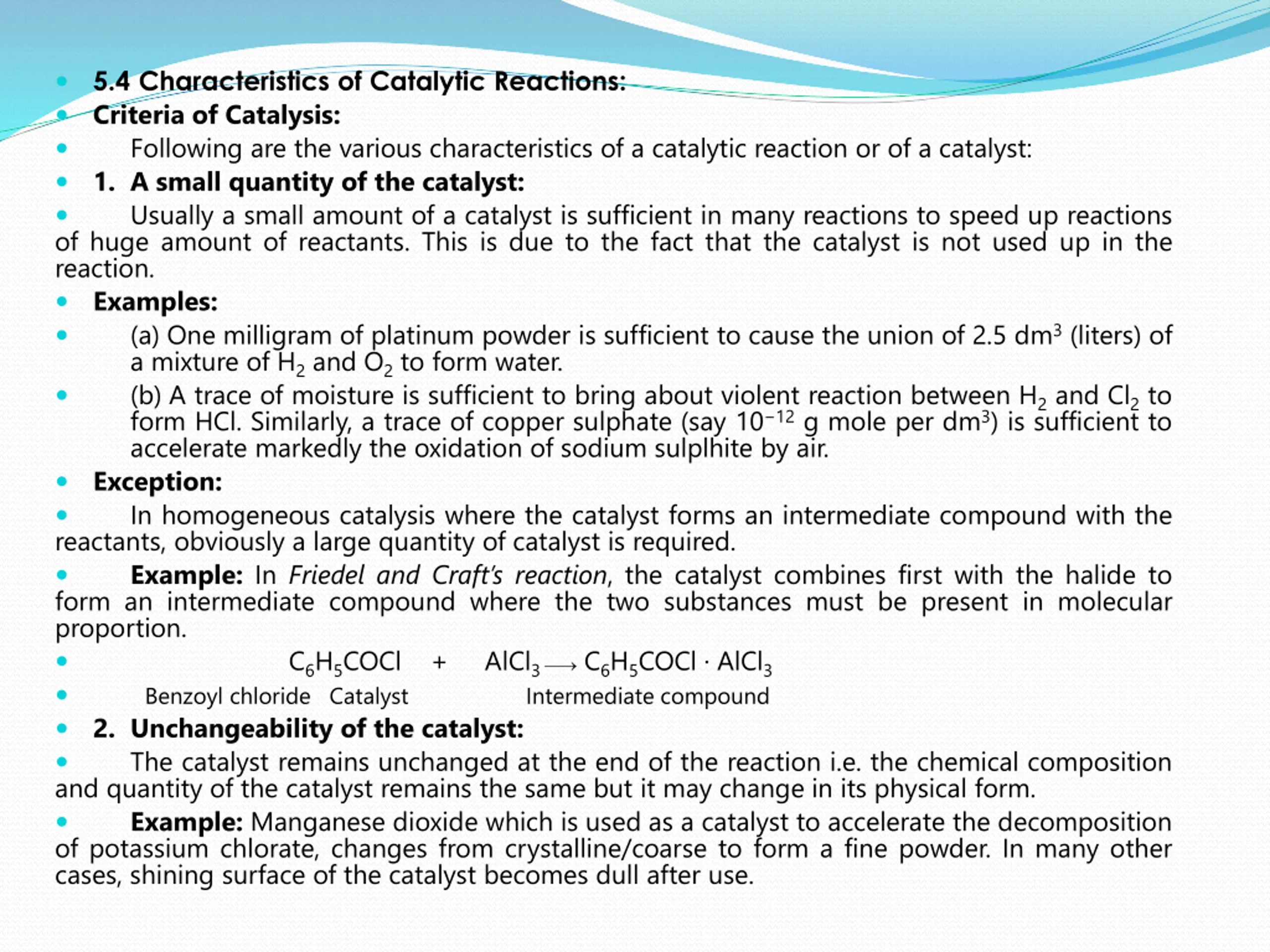 5.4 Characteristics of Catalytic Reactions: Criteria of Catalysis: Following are the various characteristics of a catalytic reaction or of a catalyst: 1. A small quantity of the catalyst: Usually a small amount of a catalyst is sufficient in many reactions to speed up reactions of huge amount of reactants. This is due to the fact that the catalyst is not used up in the reaction. Examples: (a) One milligram of platinum powder is sufficient to cause the union of 2.5 dm3 (liters) of a mixture of H2 and O2 to form water. (b) A trace of moisture is sufficient to bring about violent reaction between H2 and Cl2 to form HCl. Similarly, a trace of copper sulphate (say 10 12 g mole per dm3) is sufficient to accelerate markedly the oxidation of sodium sulplhite by air. Exception: In homogeneous catalysis where the catalyst forms an intermediate compound with the reactants, obviously a large quantity of catalyst is required. Example: In Friedel and Craft s reaction, the catalyst combines first with the halide to form an intermediate compound where the two substances must be present in molecular proportion. C6H5COCl + AlCl3 C6H5COCl AlCl3 Benzoyl chloride Catalyst Intermediate compound 2. Unchangeability of the catalyst: The catalyst remains unchanged at the end of the reaction i.e. the chemical composition and quantity of the catalyst remains the same but it may change in its physical form. Example: Manganese dioxide which is used as a catalyst to accelerate the decomposition of potassium chlorate, changes from crystalline/coarse to form a fine powder. In many other cases, shining surface of the catalyst becomes dull after use.