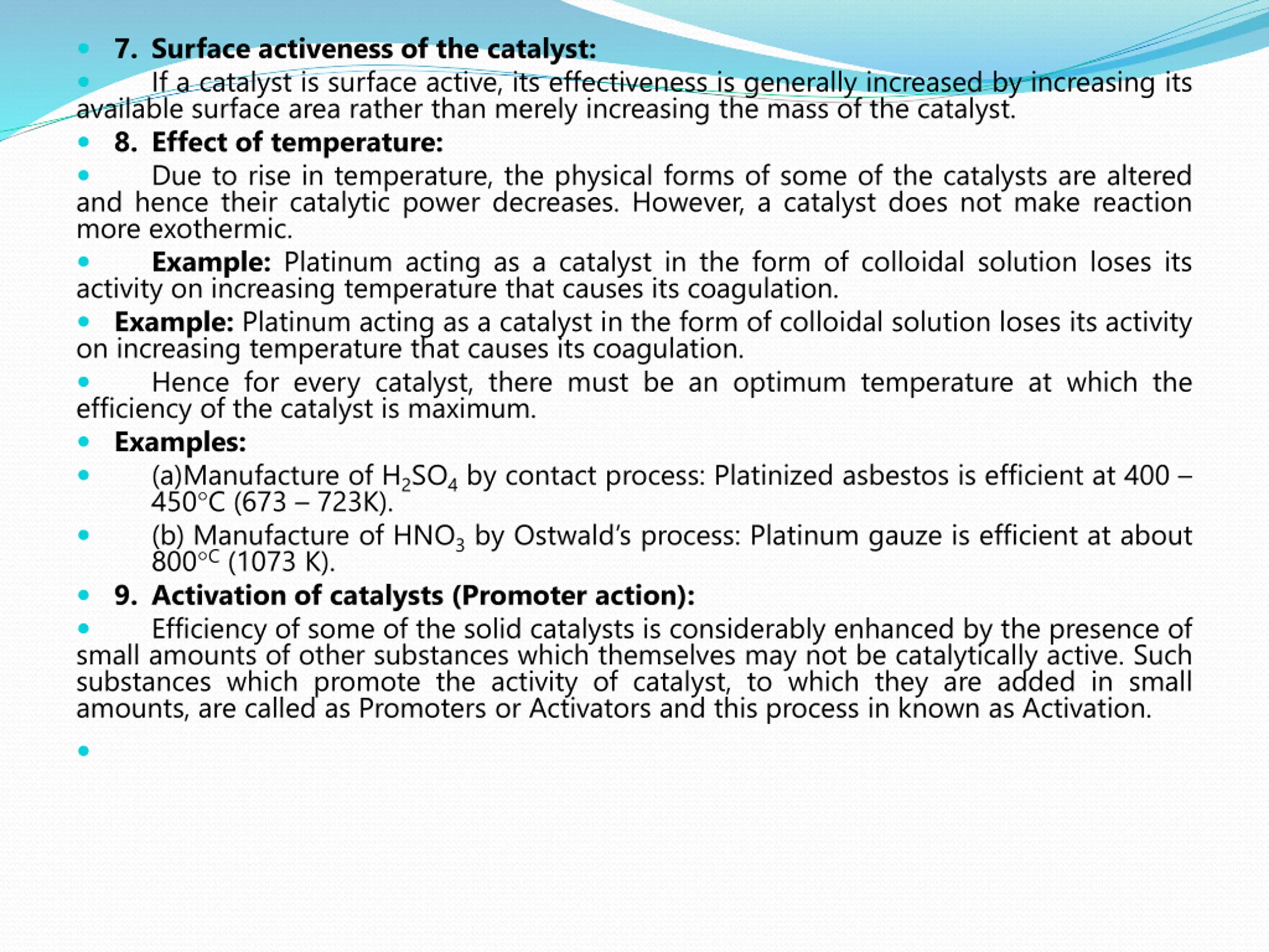 7. Surface activeness of the catalyst: If a catalyst is surface active, its effectiveness is generally increased by increasing its available surface area rather than merely increasing the mass of the catalyst. 8. Effect of temperature: Due to rise in temperature, the physical forms of some of the catalysts are altered and hence their catalytic power decreases. However, a catalyst does not make reaction more exothermic. Example: Platinum acting as a catalyst in the form of colloidal solution loses its activity on increasing temperature that causes its coagulation. Example: Platinum acting as a catalyst in the form of colloidal solution loses its activity on increasing temperature that causes its coagulation. Hence for every catalyst, there must be an optimum temperature at which the efficiency of the catalyst is maximum. Examples: (a)Manufacture of H2SO4 by contact process: Platinized asbestos is efficient at 400 450 C (673 723K). (b) Manufacture of HNO3 by Ostwald s process: Platinum gauze is efficient at about 800 C (1073 K). 9. Activation of catalysts (Promoter action): Efficiency of some of the solid catalysts is considerably enhanced by the presence of small amounts of other substances which themselves may not be catalytically active. Such substances which promote the activity of catalyst, to which they are added in small amounts, are called as Promoters or Activators and this process in known as Activation.