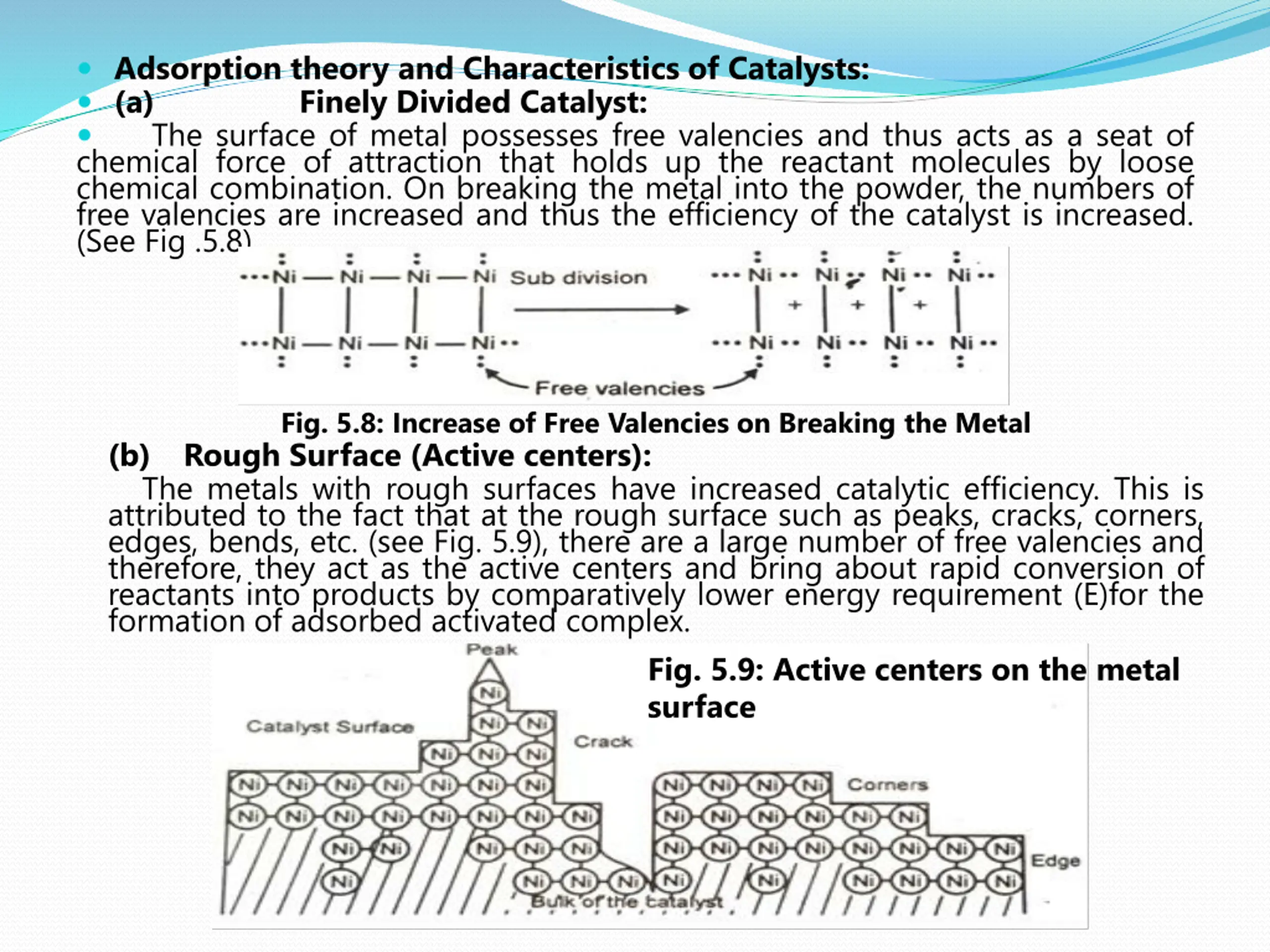Adsorption theory and Characteristics of Catalysts: (a) Finely Divided Catalyst: The surface of metal possesses free valencies and thus acts as a seat of chemical force of attraction that holds up the reactant molecules by loose chemical combination. On breaking the metal into the powder, the numbers of free valencies are increased and thus the efficiency of the catalyst is increased. (See Fig .5.8). Fig. 5.8: Increase of Free Valencies on Breaking the Metal (b) Rough Surface (Active centers): The metals with rough surfaces have increased catalytic efficiency. This is attributed to the fact that at the rough surface such as peaks, cracks, corners, edges, bends, etc. (see Fig. 5.9), there are a large number of free valencies and therefore, they act as the active centers and bring about rapid conversion of reactants into products by comparatively lower energy requirement (E)for the formation of adsorbed activated complex. Fig. 5.9: Active centers on the metal surface