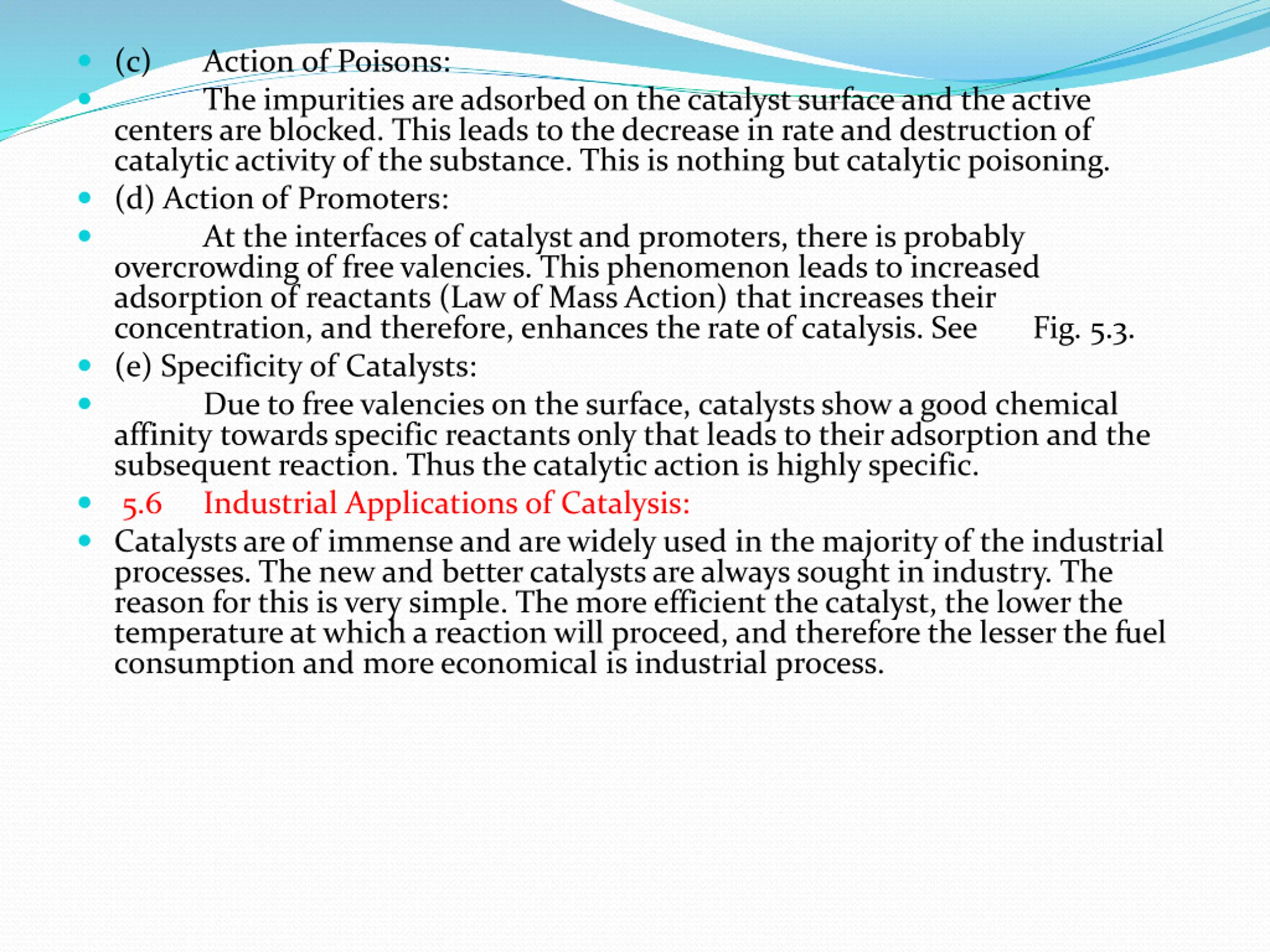 (c) centers are blocked. This leads to the decrease in rate and destruction of catalytic activity of the substance. This is nothing but catalytic poisoning. (d) Action of Promoters: At the interfaces of catalyst and promoters, there is probably overcrowding of free valencies. This phenomenon leads to increased adsorption of reactants (Law of Mass Action) that increases their concentration, and therefore, enhances the rate of catalysis. See Fig. 5.3. (e) Specificity of Catalysts: Due to free valencies on the surface, catalysts show a good chemical affinity towards specific reactants only that leads to their adsorption and the subsequent reaction. Thus the catalytic action is highly specific. 5.6 Industrial Applications of Catalysis: Catalysts are of immense and are widely used in the majority of the industrial processes. The new and better catalysts are always sought in industry. The reason for this is very simple. The more efficient the catalyst, the lower the temperature at which a reaction will proceed, and therefore the lesser the fuel consumption and more economical is industrial process. Action of Poisons: The impurities are adsorbed on the catalyst surface and the active