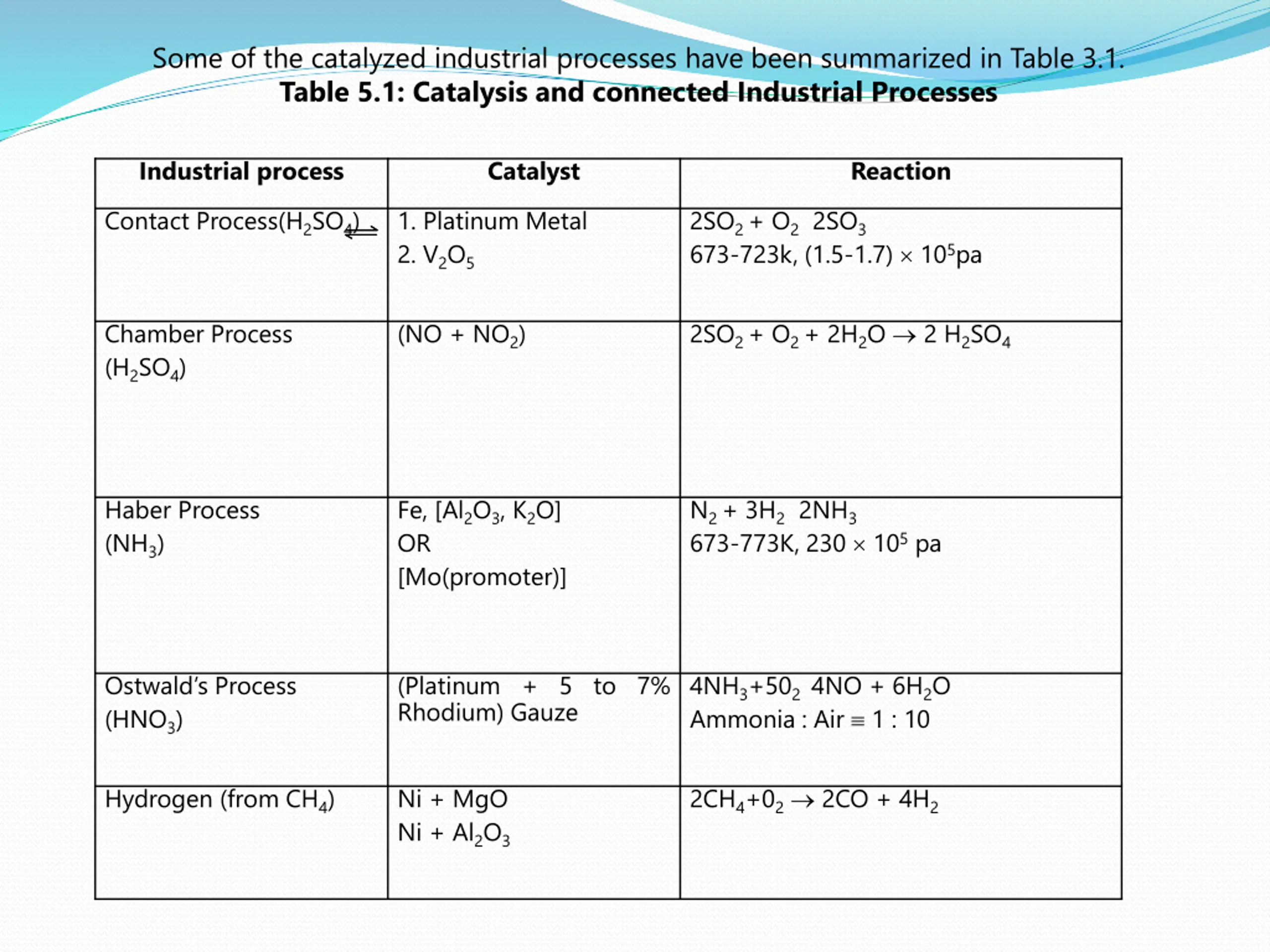 Some of the catalyzed industrial processes have been summarized in Table 3.1. Table 5.1: Catalysis and connected Industrial Processes Industrial process Catalyst Reaction Contact Process(H2SO4) 1. Platinum Metal 2. V2O5 2SO2 + O2 2SO3 673-723k, (1.5-1.7) 105pa Chamber Process (H2SO4) (NO + NO2) 2SO2 + O2 + 2H2O 2 H2SO4 Haber Process (NH3) Fe, [Al2O3, K2O] OR [Mo(promoter)] N2 + 3H2 2NH3 673-773K, 230 105 pa Ostwald s Process (HNO3) (Platinum + 5 to 7% Rhodium) Gauze 4NH3+502 4NO + 6H2O Ammonia : Air 1 : 10 Hydrogen (from CH4) Ni + MgO Ni + Al2O3 2CH4+02 2CO + 4H2