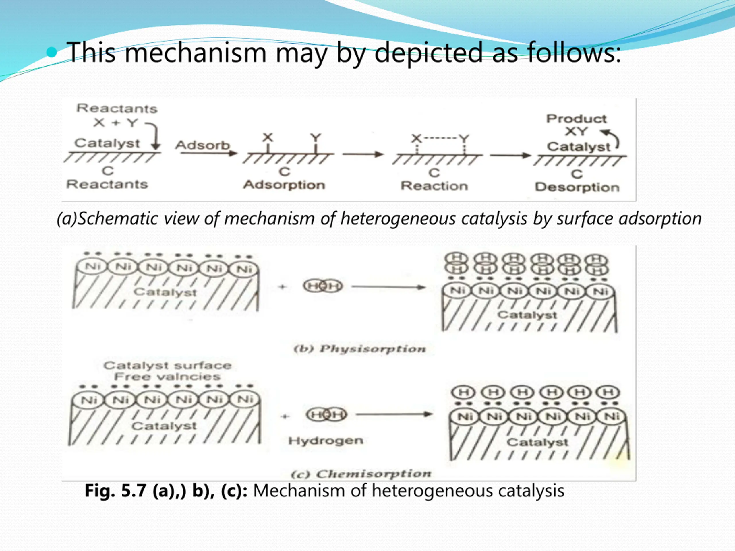 (ii) Adsorption Theory: The Modern Theory of Contact Catalysis: This theory was first put forward by Faraday in 1833. It is applicable to heterogeneous catalysis only. This theory is regarded as an outcome of the complete fusion of the two effects, namely simple adsorption and intermediate compound formation. According to this theory, the action of catalyst postulates that: (a) The reactants are adsorbed on the surface of a solid catalyst either by physical adsorption (physisorption) or by chemisorptions [See Fig. 5.7 (b) and (c)] and their concentration goes on increasing thereby causes an increase in the rate of reaction in accordance to the Law of Mass Action. (b) Due to the free valencies on the surface of the catalyst, the molecules of reactants enter into a sort of loose chemical combination with the catalyst and hence with each other. [See Fig.5.7 (a) and (c)]. At this stage, the system is assumed to form an adsorbed activated complex that provides a new pathway to the reaction having lower enthalpy of activation (Ein Fig. 5.5).For example: The adsorbed activated complex being associated with higher amount of energy than those of reactants and products, it is under strain and is highly reactive. It is, therefore, readily desorted and decomposes to products leaving the surface free for next reactant molecules so that the process is continued