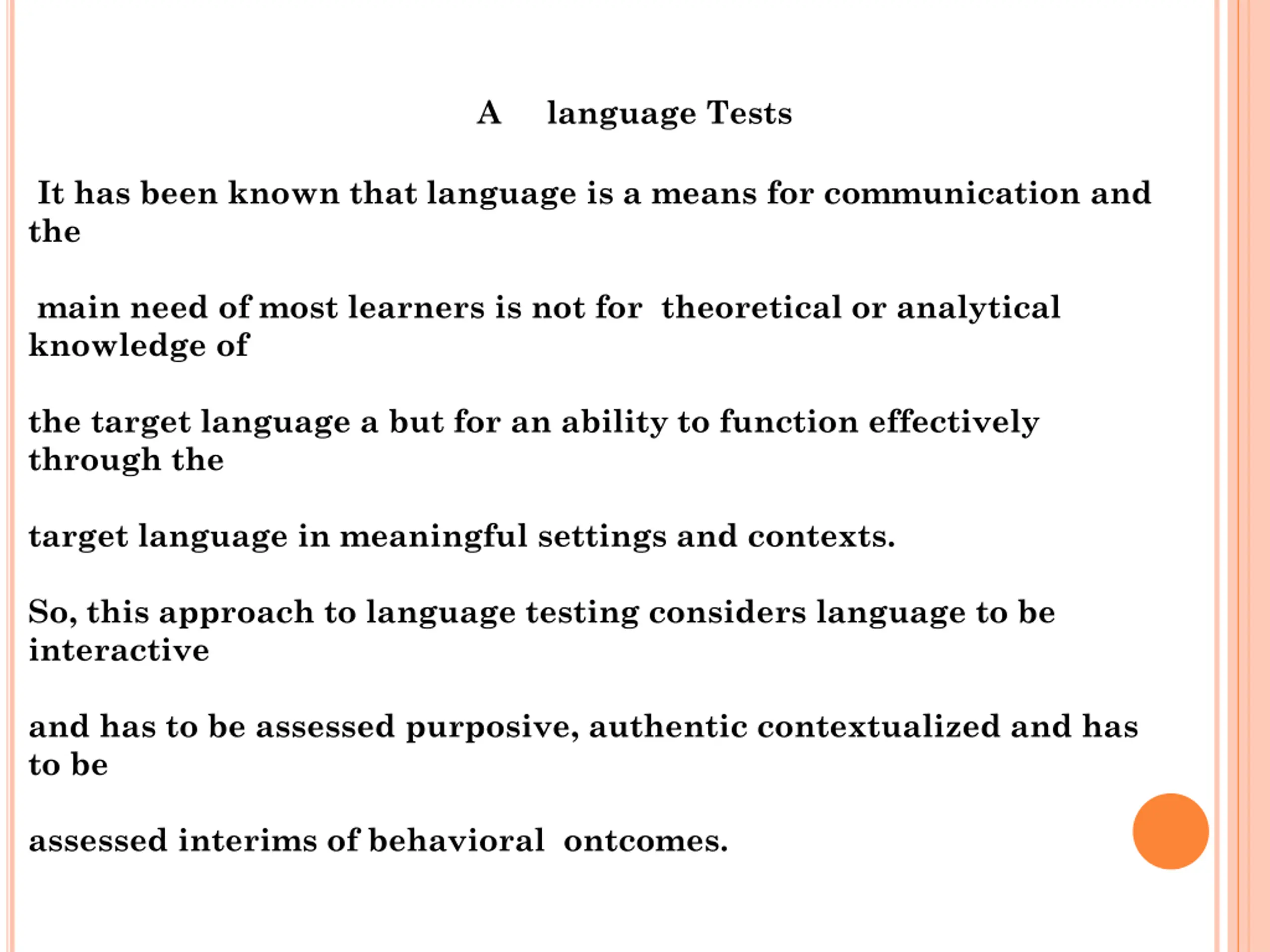 A language Tests It has been known that language is a means for communication and the main need of most learners is not for theoretical or analytical knowledge of the target language a but for an ability to function effectively through the target language in meaningful settings and contexts. So, this approach to language testing considers language to be interactive and has to be assessed purposive, authentic contextualized and has to be assessed interims of behavioral ontcomes.