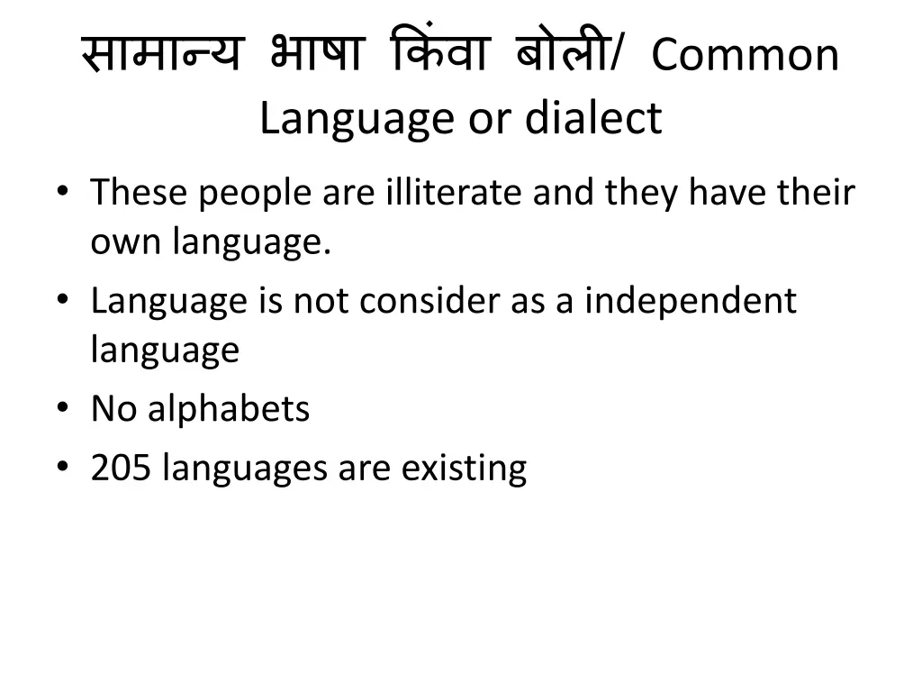 / Common Language or dialect These people are illiterate and they have their own language. Language is not consider as a independent language No alphabets 205 languages are existing