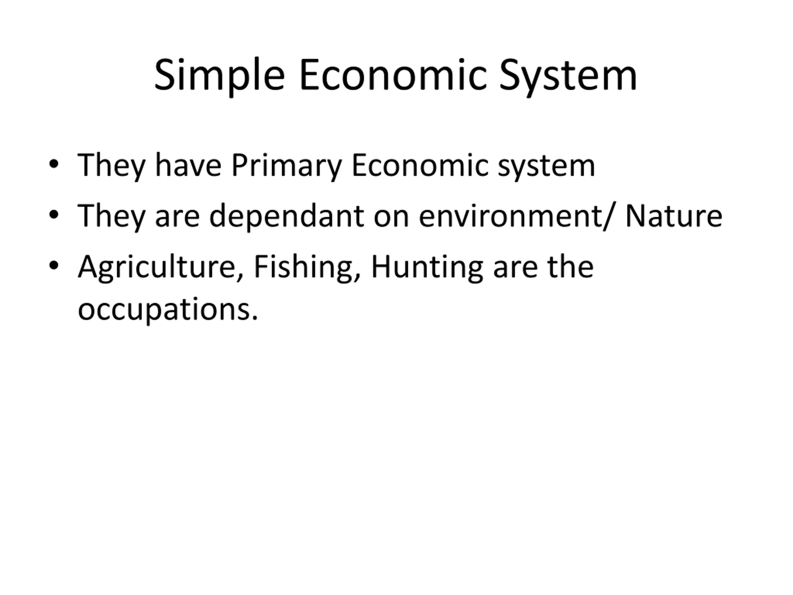 Simple Economic System They have Primary Economic system They are dependant on environment/ Nature Agriculture, Fishing, Hunting are the occupations.
