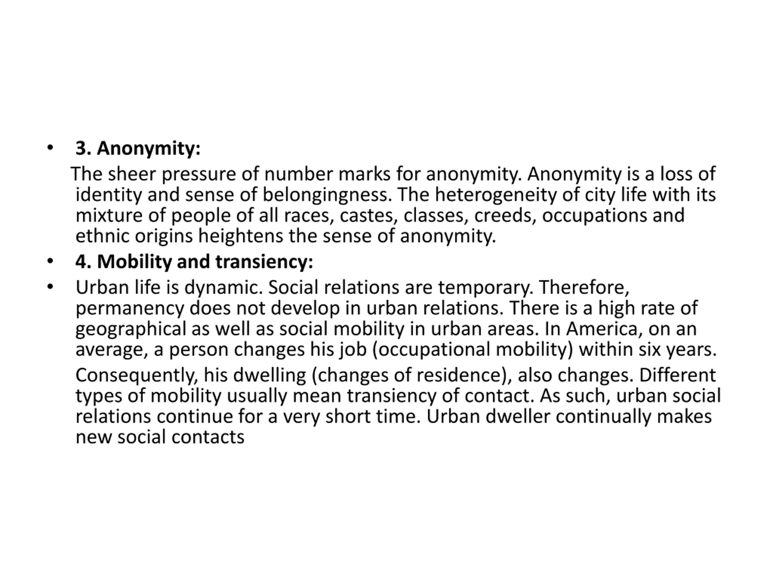 3. Anonymity: The sheer pressure of number marks for anonymity. Anonymity is a loss of identity and sense of belongingness. The heterogeneity of city life with its mixture of people of all races, castes, classes, creeds, occupations and ethnic origins heightens the sense of anonymity. 4. Mobility and transiency: Urban life is dynamic. Social relations are temporary. Therefore, permanency does not develop in urban relations. There is a high rate of geographical as well as social mobility in urban areas. In America, on an average, a person changes his job (occupational mobility) within six years. Consequently, his dwelling (changes of residence), also changes. Different types of mobility usually mean transiency of contact. As such, urban social relations continue for a very short time. Urban dweller continually makes new social contacts