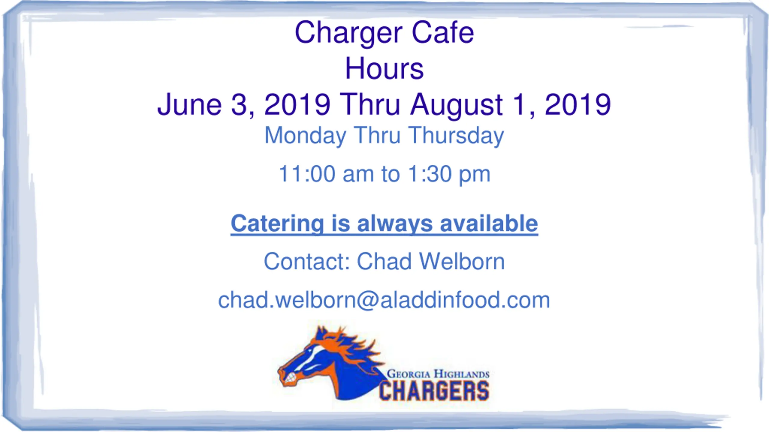 Charger Cafe Hours June 3, 2019 Thru August 1, 2019 Monday Thru Thursday 11:00 am to 1:30 pm Catering is always available Contact: Chad Welborn chad.welborn@aladdinfood.com