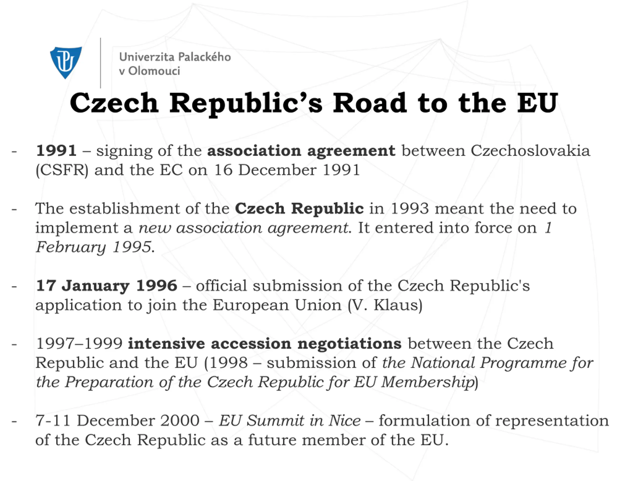 Czech Republics Road to the EU - 1991 signing of the association agreement between Czechoslovakia (CSFR) and the EC on 16 December 1991 - The establishment of the Czech Republic in 1993 meant the need to implement a new association agreement. It entered into force on 1 February 1995. - 17 January 1996 official submission of the Czech Republic's application to join the European Union (V. Klaus) - 1997 1999 intensive accession negotiations between the Czech Republic and the EU (1998 submission of the National Programme for the Preparation of the Czech Republic for EU Membership) - 7-11 December 2000 EU Summit in Nice formulation of representation of the Czech Republic as a future member of the EU.