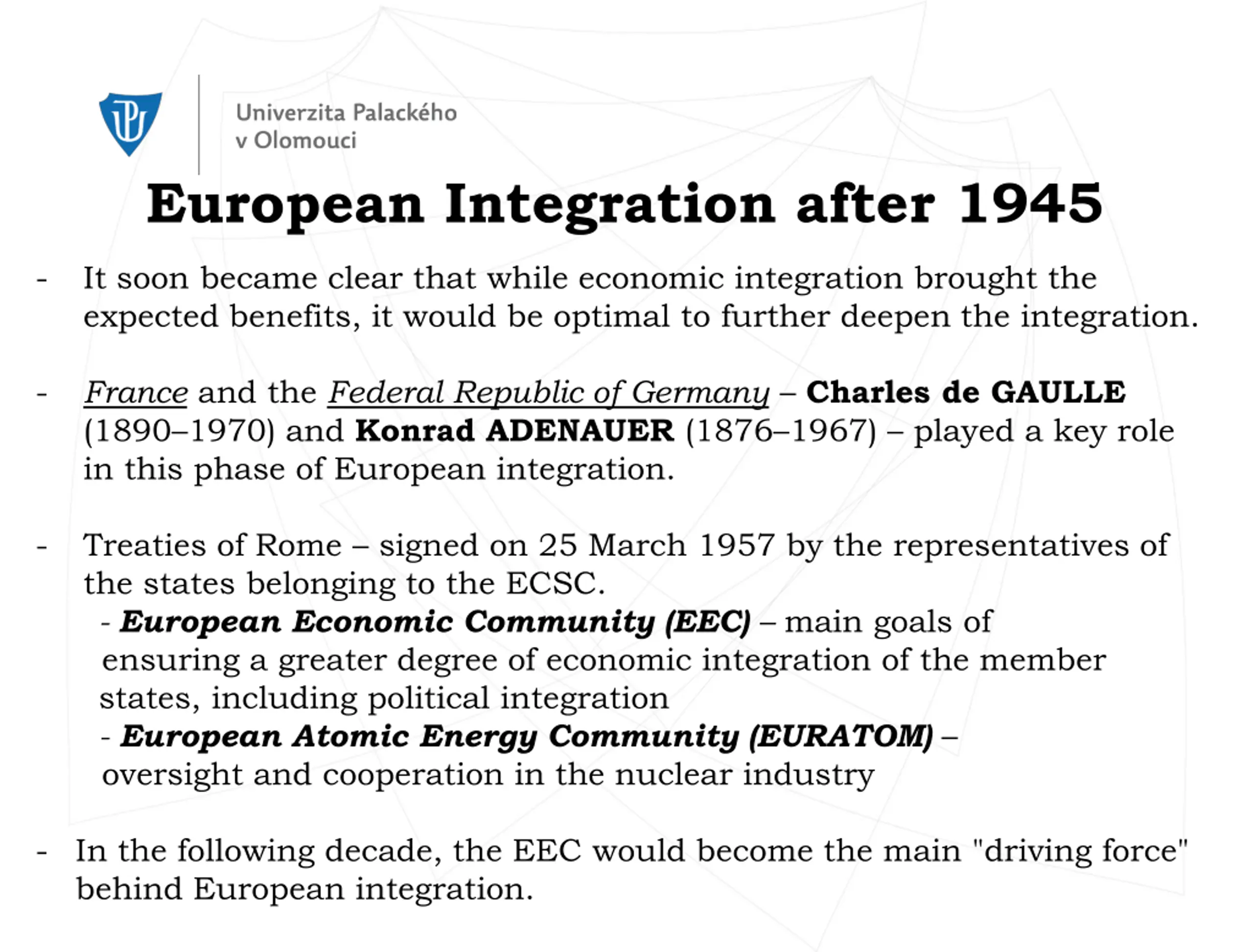 European Integration after 1945 - It soon became clear that while economic integration brought the expected benefits, it would be optimal to further deepen the integration. - France and the Federal Republic of Germany Charles de GAULLE (1890 1970) and Konrad ADENAUER (1876 1967) played a key role in this phase of European integration. - Treaties of Rome signed on 25 March 1957 by the representatives of the states belonging to the ECSC. - European Economic Community (EEC) main goals of ensuring a greater degree of economic integration of the member states, including political integration - European Atomic Energy Community (EURATOM) oversight and cooperation in the nuclear industry - In the following decade, the EEC would become the main "driving force" behind European integration.