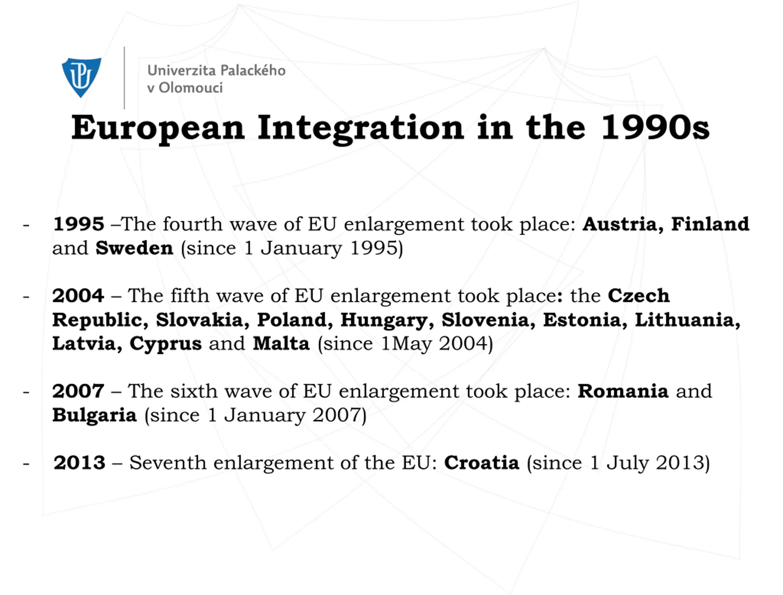 European Integration in the 1990s - 1995 The fourth wave of EU enlargement took place: Austria, Finland and Sweden (since 1 January 1995) - 2004 The fifth wave of EU enlargement took place: the Czech Republic, Slovakia, Poland, Hungary, Slovenia, Estonia, Lithuania, Latvia, Cyprus and Malta (since 1May 2004) - 2007 The sixth wave of EU enlargement took place: Romania and Bulgaria (since 1 January 2007) - 2013 Seventh enlargement of the EU: Croatia (since 1 July 2013)