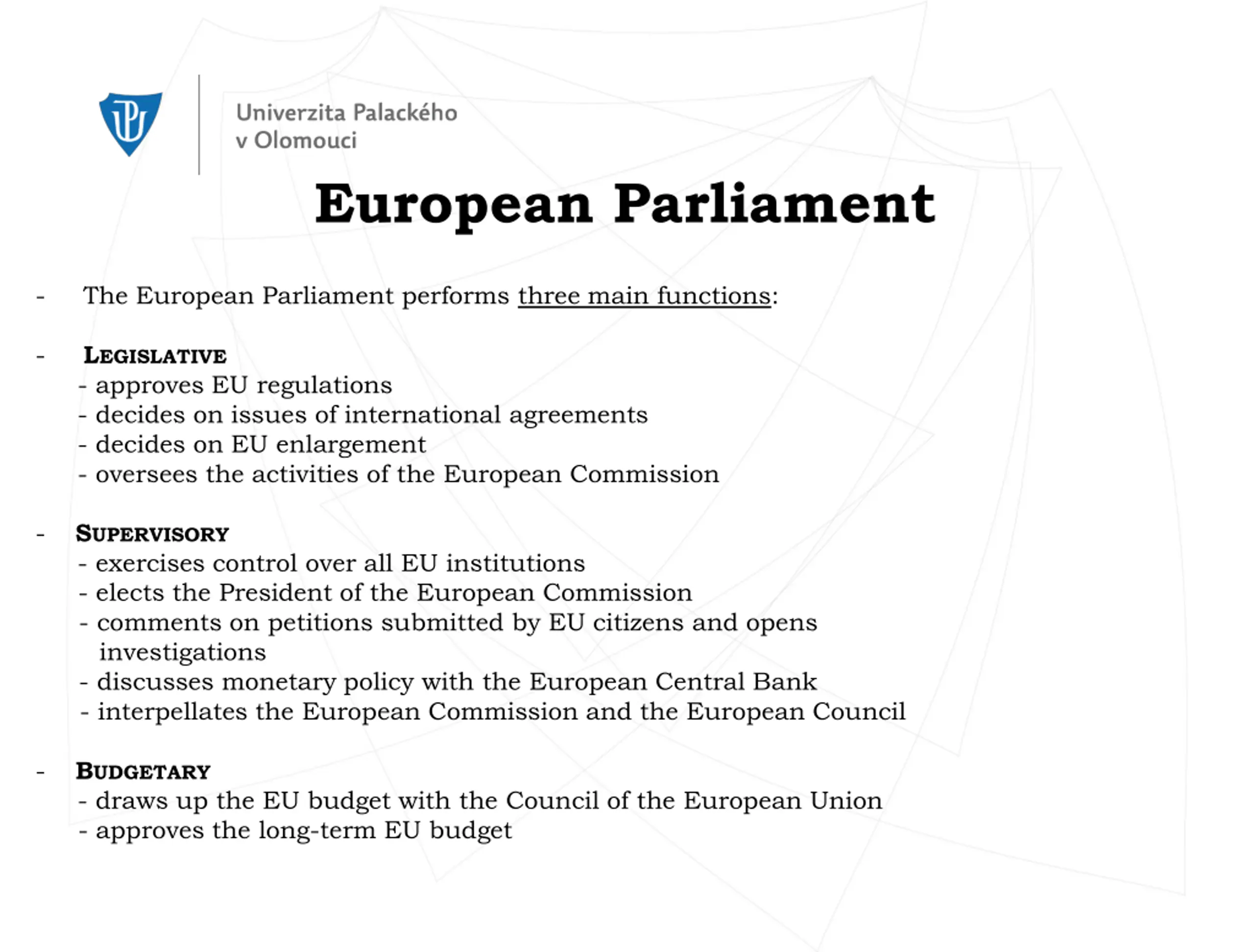 European Parliament - The European Parliament performs three main functions: - LEGISLATIVE - approves EU regulations - decides on issues of international agreements - decides on EU enlargement - oversees the activities of the European Commission - SUPERVISORY - exercises control over all EU institutions - elects the President of the European Commission - comments on petitions submitted by EU citizens and opens investigations - discusses monetary policy with the European Central Bank - interpellates the European Commission and the European Council - BUDGETARY - draws up the EU budget with the Council of the European Union - approves the long-term EU budget