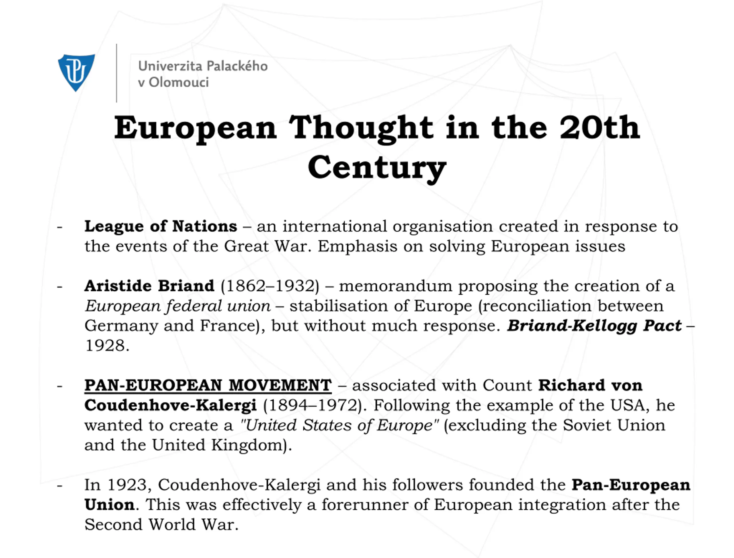 European Thought in the 20th Century - League of Nations an international organisation created in response to the events of the Great War. Emphasis on solving European issues - Aristide Briand (1862 1932) memorandum proposing the creation of a European federal union stabilisation of Europe (reconciliation between Germany and France), but without much response. Briand-Kellogg Pact 1928. - PAN-EUROPEAN MOVEMENT associated with Count Richard von Coudenhove-Kalergi (1894 1972). Following the example of the USA, he wanted to create a "United States of Europe" (excluding the Soviet Union and the United Kingdom). - In 1923, Coudenhove-Kalergi and his followers founded the Pan-European Union. This was effectively a forerunner of European integration after the Second World War.